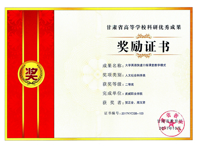 近日從學(xué)院科研處傳來喜訊,我系教師賀正全申報(bào)的《大學(xué)英語快速口練課堂教學(xué)模式》榮獲甘肅省教育廳頒發(fā)的2017年甘肅省高等學(xué)??蒲袃?yōu)秀成果二等獎(jiǎng)。這是我院自建院以來獲得的最高級別的高??蒲袃?yōu)秀成果獎(jiǎng)。本次獲得二等獎(jiǎng)的科研成果共有154項(xiàng),其中高職高專報(bào)送的科研成果只有9項(xiàng)獲得二等獎(jiǎng)。