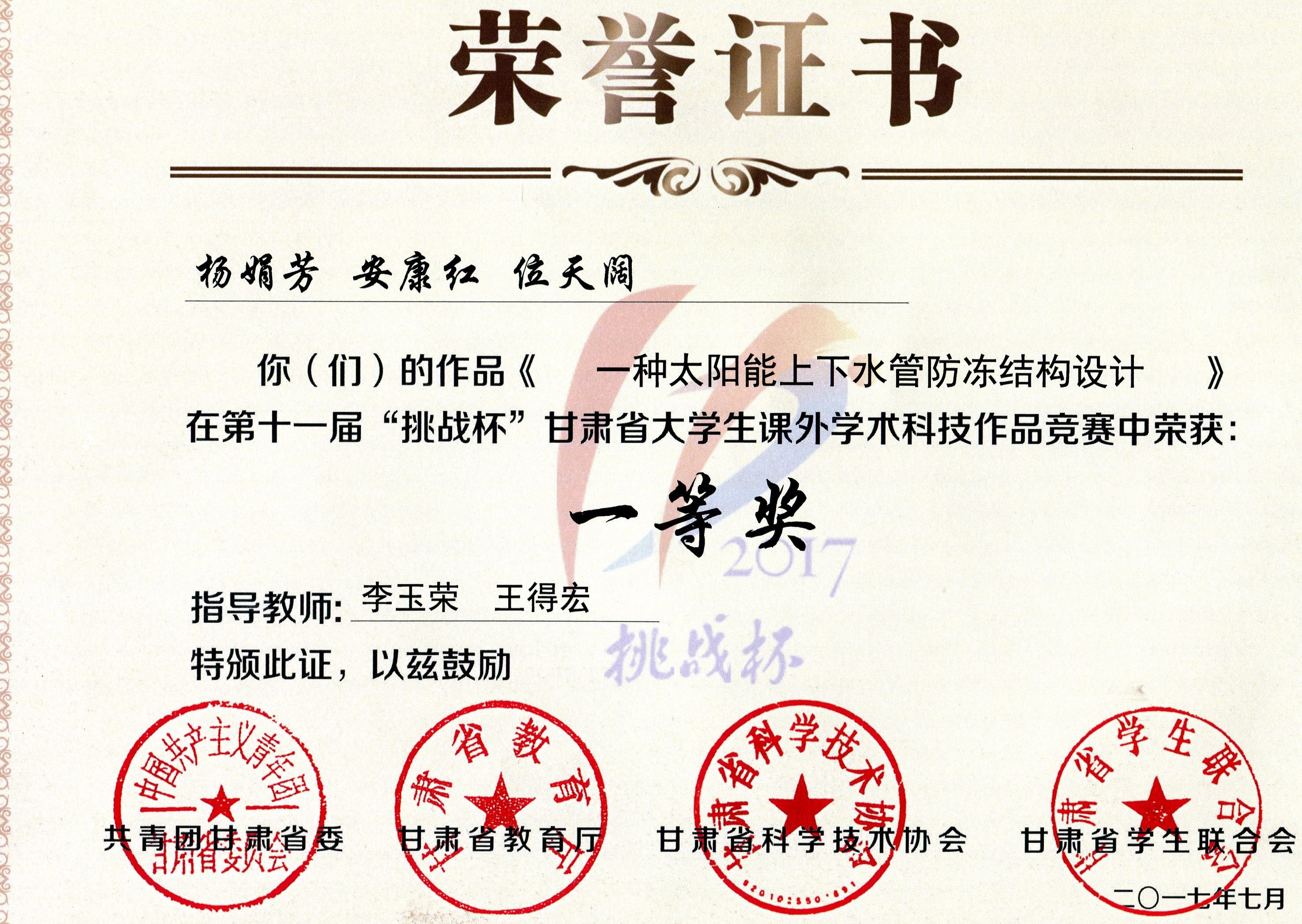 第十一屆“挑戰(zhàn)杯”甘肅省大學(xué)生課外學(xué)術(shù)科技作品競(jìng)賽一等獎(jiǎng)
