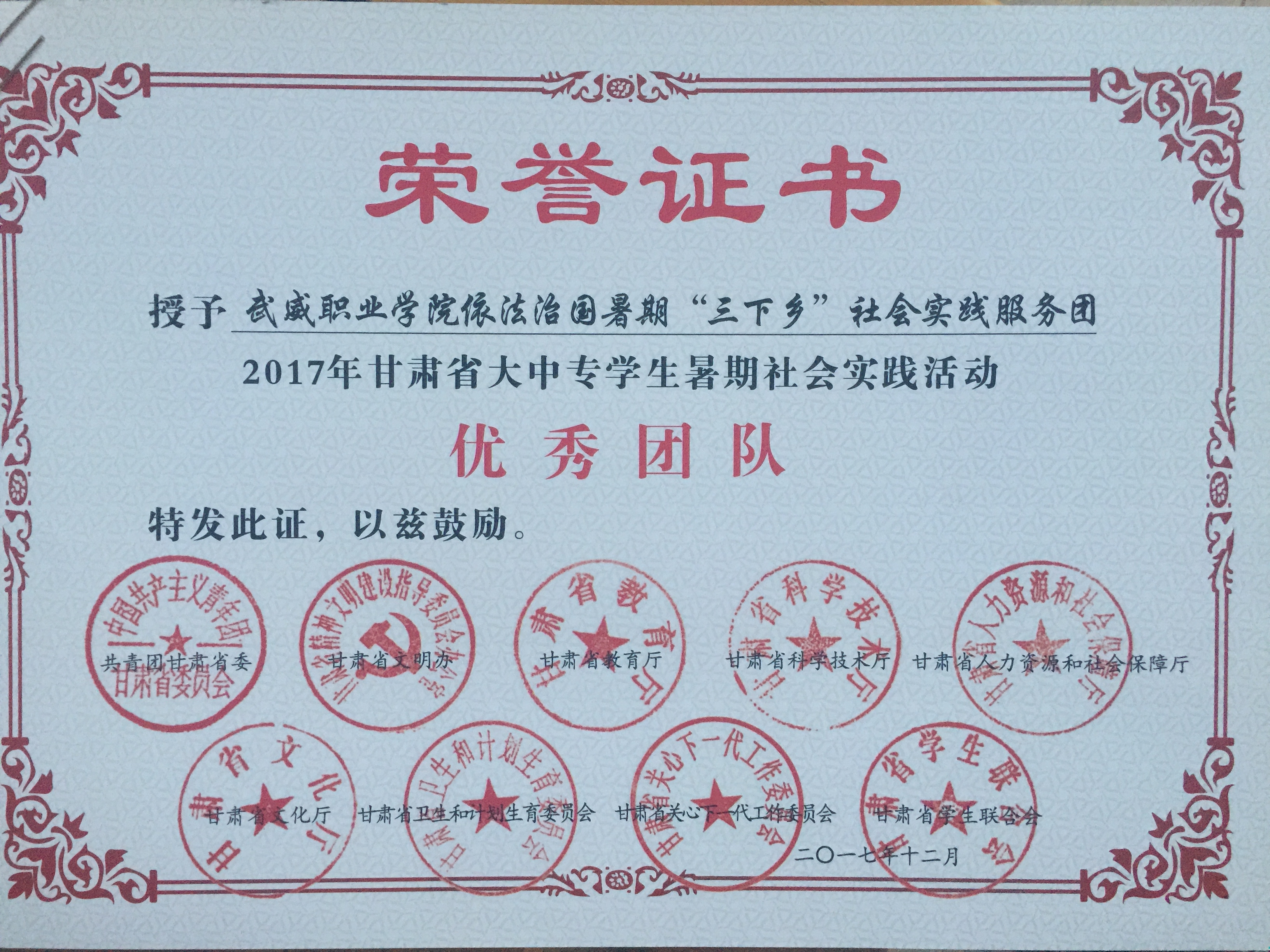 2017年甘肅省大中專學生暑期社會實踐活動“優(yōu)秀團隊”--依法治國暑期“三下鄉(xiāng)”社會實踐服務(wù)團