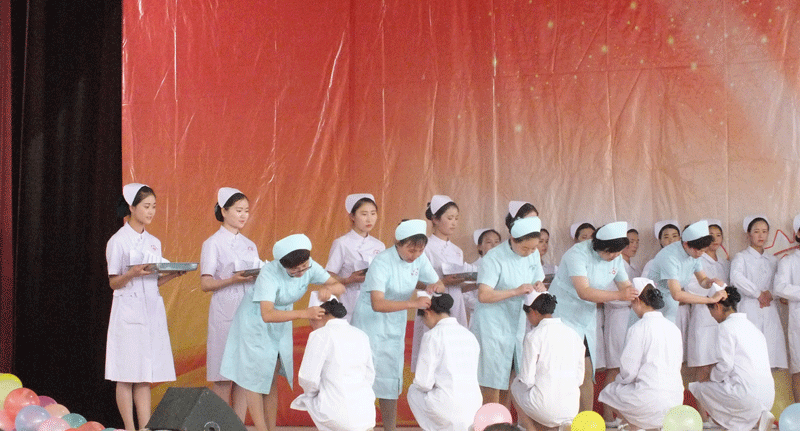 在慶祝活動中,2015級畢業(yè)生代表進行“心肺復(fù)蘇技術(shù)”及“右踝關(guān)節(jié)扭傷包扎技術(shù)”表演, 舉行了文藝演出,向全體觀眾展示了護理系學(xué)生的精神風(fēng)貌與才藝。