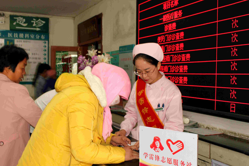 學(xué)雷鋒志愿服務(wù)站工作人員主要由年輕護士們擔任。她們身著護士裝,佩戴印有“學(xué)雷鋒志愿者服務(wù)”字樣綬帶,主動為患者服務(wù)。志愿者們提供的主要服務(wù)項目有:在門診為老、弱、病、殘、孕等患者提供輪椅擔架租借。為患者提供開水、就醫(yī)導(dǎo)診、戒煙勸導(dǎo)、醫(yī)學(xué)人文關(guān)懷、慢性病知識普及和健康宣教等便民利民服務(wù),受到了患者及家屬的一致好評。