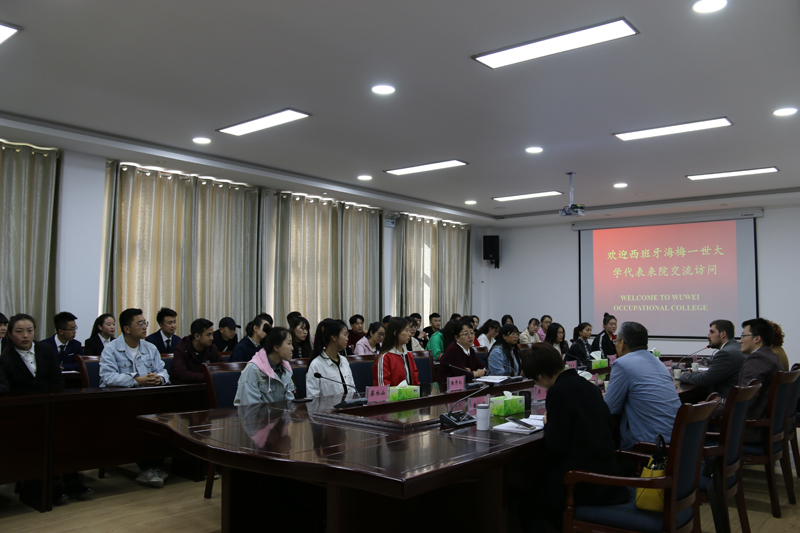 座談會上,田迎春代表全院師生對海梅一世大學(xué)到訪學(xué)院表示歡迎,對省國際交流與合作服務(wù)中心對學(xué)院的關(guān)心表示感謝,并向來訪客人簡要介紹了武威文化歷史、學(xué)院建設(shè)發(fā)展情況、學(xué)院國際交流與合作開展情況。來訪客人對學(xué)院近年來的巨大發(fā)展表示贊賞,對學(xué)院國際交流與合作開展工作表示肯定。Ana女士通過PPT展示介紹了海梅一世大學(xué),希望雙方進一步進行合作。賓主雙方還就校際交流、語言培訓(xùn)、赴西班牙專升碩留學(xué)項目等共同關(guān)心的問題進行了深入交流。
