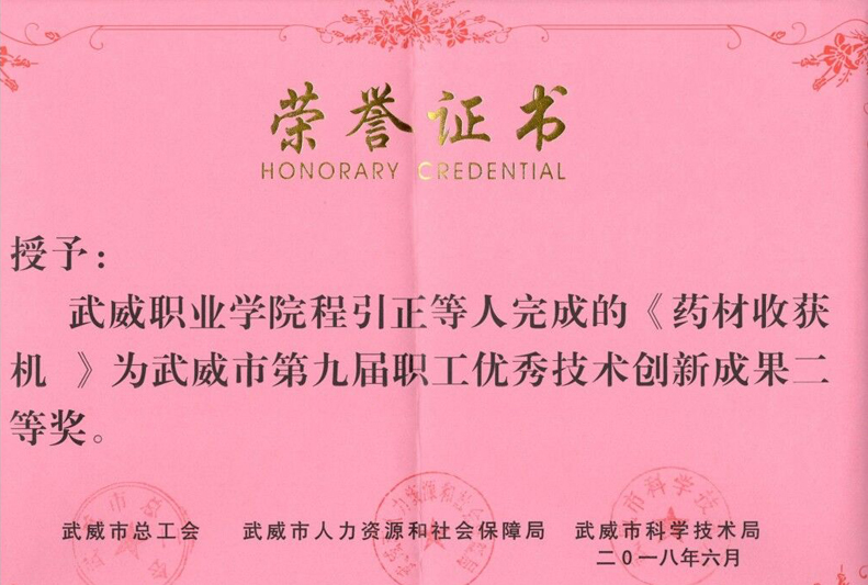 近日,武威市總工會(huì)、武威市人力資源和社會(huì)保障局、武威市科學(xué)技術(shù)局在全市企事業(yè)單位和廣大職工中廣泛開展了征集評(píng)選職工優(yōu)秀技術(shù)創(chuàng)新成果活動(dòng)。經(jīng)過逐級(jí)推薦、專家評(píng)審、網(wǎng)絡(luò)公示等程序,我系教師程引正等完成的《藥材收獲機(jī)》喜獲武威市第九屆職工優(yōu)秀技術(shù)創(chuàng)新成果二等獎(jiǎng)。