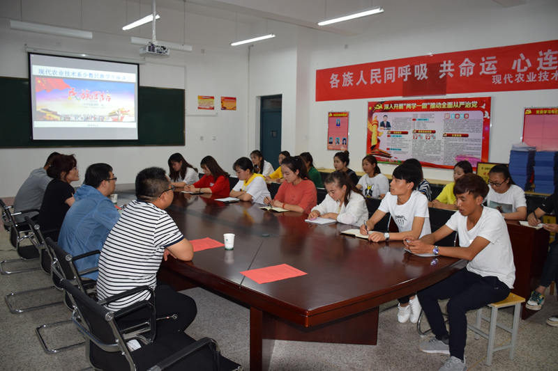 ???? 為認真貫徹落實《學(xué)院第15個民族團結(jié)進步宣傳月活動實施方案》,6月12日,現(xiàn)代農(nóng)業(yè)技術(shù)系在行樹樓教學(xué)區(qū)309會議室開展民族團結(jié)月系列活動。系黨總支書記晏素珍、龔建軍、蔡飛老師及全系少數(shù)民族學(xué)生參加會議,會議由系輔導(dǎo)員蔡海老師主持。