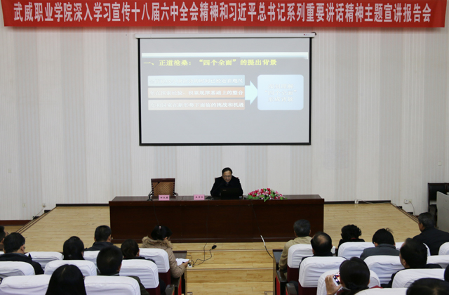 根據(jù)省委和全省宣傳工作會(huì)議關(guān)于在全省組織開(kāi)展深入學(xué)習(xí)宣傳十八屆五中全會(huì)精神和習(xí)近平總書記系列重要講話精神主題宣講活動(dòng)的通知要求,為向全院黨員干部和師生宣傳好、解讀好十八屆五中、六中全會(huì)精神和習(xí)近平總書記系列重要講話的實(shí)質(zhì)內(nèi)涵和深遠(yuǎn)意義,將全會(huì)精神和總書記系列重要講話精神作為指導(dǎo)和推動(dòng)學(xué)院各項(xiàng)事業(yè)快速發(fā)展的科學(xué)理論和強(qiáng)大動(dòng)力。10月29日上午,“武威職業(yè)學(xué)院深入學(xué)習(xí)宣傳十八屆五中、六中全會(huì)精神和習(xí)近平總書記系列重要講話精神主題宣講報(bào)告會(huì)”在學(xué)院尚德樓正德廳舉行。會(huì)議邀請(qǐng)省委講師團(tuán)成員、蘭州大學(xué)馬克思主義學(xué)院博士生導(dǎo)師王學(xué)儉教授蒞臨學(xué)院,作題為“四個(gè)全面”戰(zhàn)略布局解讀的宣講報(bào)告。學(xué)院黨委副書記趙明,副院長(zhǎng)王永緒、潘玉華、田迎春,全體中層干部,各部門師生代表共計(jì)260余人參加宣講報(bào)告會(huì)。報(bào)告會(huì)由田迎春主持。