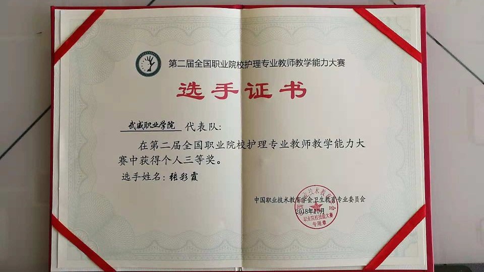 競(jìng)賽共分為理論考核、說(shuō)課程和臨床護(hù)理技能操作三個(gè)部分。其中,臨床護(hù)理技能操作部又分為三項(xiàng),心肺復(fù)蘇術(shù)和靜脈輸液操作技術(shù)為必選項(xiàng)目,置胃管技術(shù)和氣管切開護(hù)理技術(shù)為抽選項(xiàng)目。經(jīng)過(guò)三天緊張激烈的比拼,通過(guò)了全部考核內(nèi)容的綜合評(píng)定,最終張彩霞老師獲得了三等獎(jiǎng)。