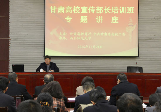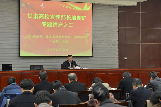 王嘉毅在專題講座中介紹了甘肅高等教育現(xiàn)狀、存在問題和“十三五”發(fā)展目標(biāo)。他指出,高校宣傳思想工作主要任務(wù)要把學(xué)習(xí)貫徹落實黨的十八大以來的重大部署,特別是六中全會精神和習(xí)近平總書記系列重要講話精神作為重要任務(wù)來抓;要把貫徹落實中宣部、教育部黨組《關(guān)于加強(qiáng)和改進(jìn)高校宣傳思想工作隊伍建設(shè)的意見》精神和省委辦公廳、省政府辦公廳《關(guān)于進(jìn)一步加強(qiáng)和改進(jìn)新形勢下高校宣傳思想工作的實施意見》作為重要任務(wù)來抓;要把進(jìn)一步弘揚(yáng)社會主義核心價值觀、加強(qiáng)正面宣傳、傳播正能量作為重要任務(wù)來抓。通過準(zhǔn)確把握新形勢下高校宣傳思想工作的動態(tài),分析研判我省高校宣傳思想工作面臨的問題,切實加強(qiáng)高校意識形態(tài)領(lǐng)域的工作,提升網(wǎng)絡(luò)輿情掌控應(yīng)對能力,積極開展馬克思主義研究,全面繁榮哲學(xué)社會科學(xué),提高覺悟,凝聚共識,強(qiáng)化措施,全面推動高校宣傳思想工作質(zhì)量提升和創(chuàng)新發(fā)展。