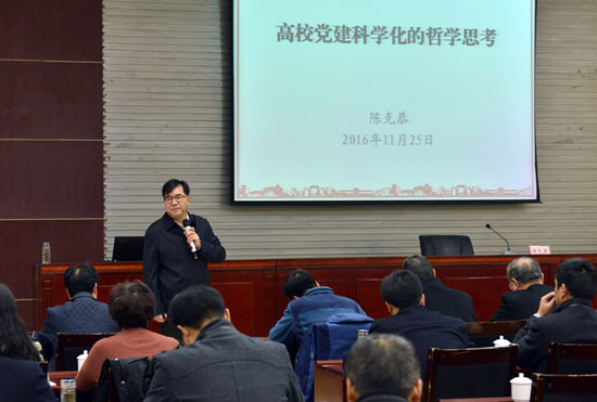 陳克恭在題為《高校黨建科學(xué)化的哲學(xué)思考》的講座中,以其獨(dú)特視角通過回顧中國近代史,闡明了中國共產(chǎn)黨執(zhí)政的客觀實在性。他認(rèn)為,要用中國智慧、中國思維把馬克思主義和西方科學(xué)有機(jī)統(tǒng)一起來,構(gòu)建具有中國特色、中國風(fēng)格、中國氣派的哲學(xué)社會科學(xué)體系。并以西北師大為例,就大學(xué)治理體系的現(xiàn)代化提出了自己的思考。