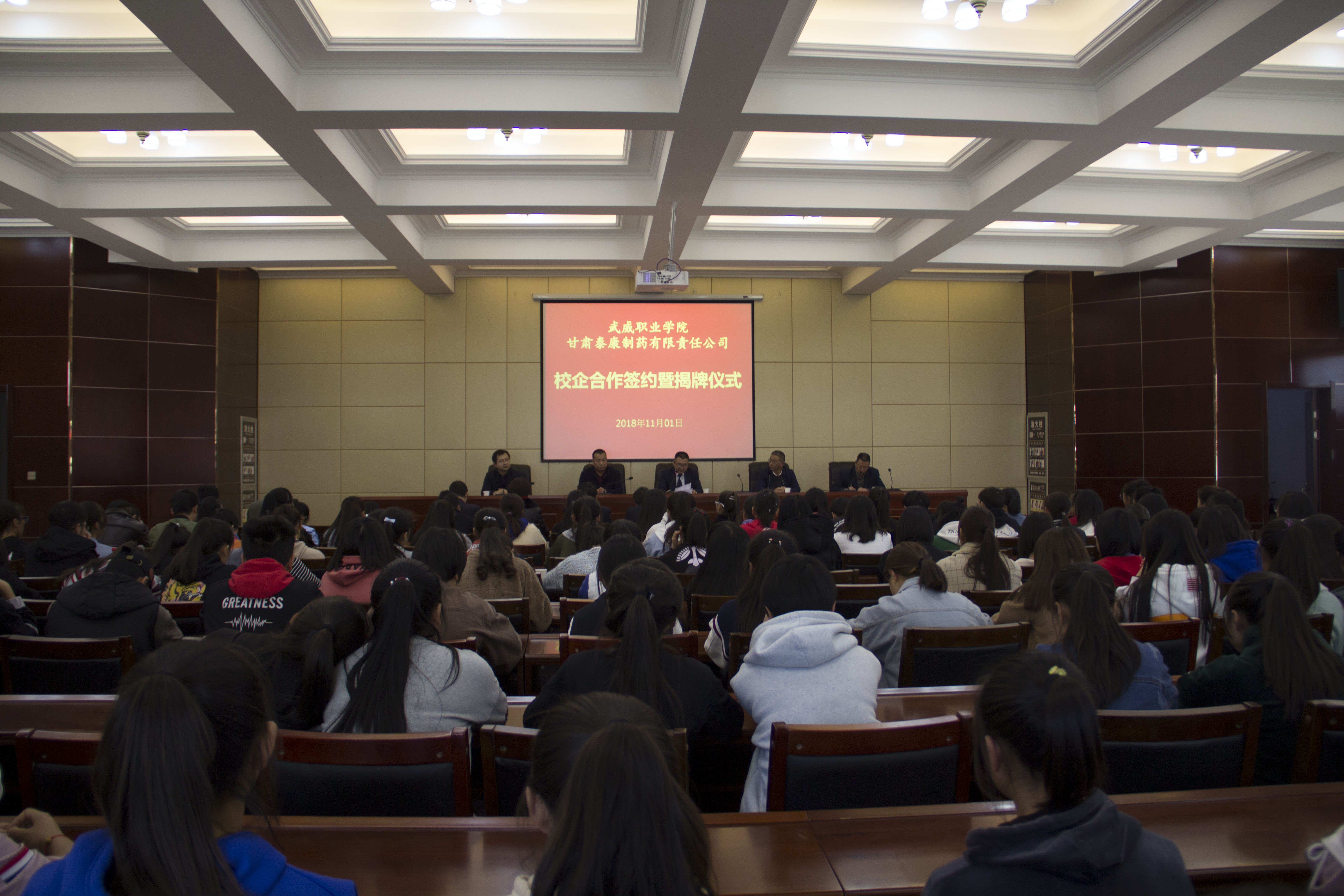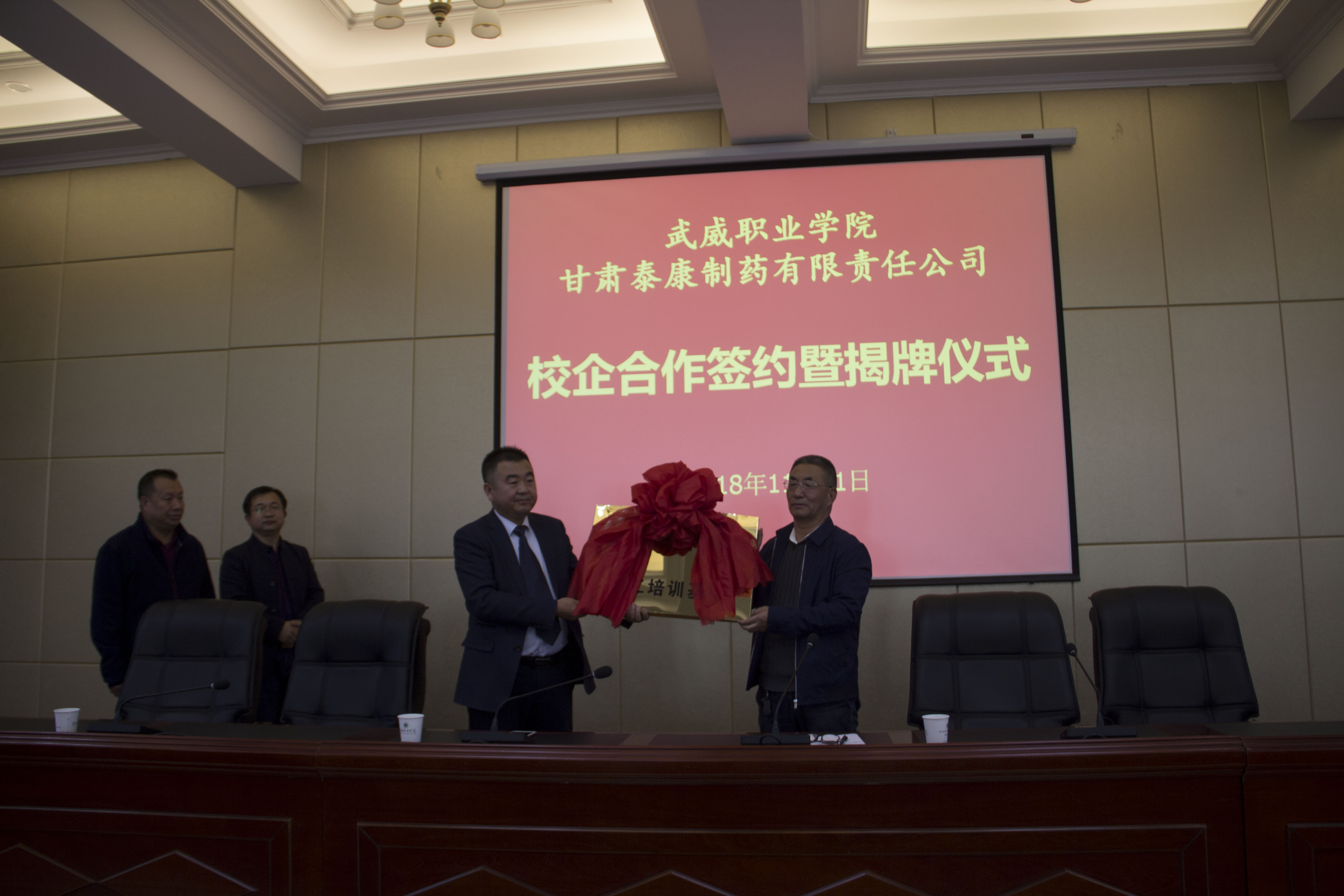 為提高人才培養(yǎng)質量和辦學水平,加強校企協(xié)同育人機制建設,11月1日下午,藥學系與甘肅泰康制藥有限責任公司校企合作共建“就業(yè)實習基地”簽約揭牌儀式在行樹樓北側會議室隆重舉行。甘肅泰康制藥有限責任公司投資方—北京久朝集團產業(yè)中心總監(jiān)楊宏超、公司總工程師毛著鴻、財務總監(jiān)郝敏等企業(yè)領導出席本次儀式。學院教務處處長仲生仁、招生就業(yè)處處長蔡柱山、藥學系主任魏潤明、副主任楊建美、黨總支副書記單光年及藥學系160余名師生參加了此次簽約揭牌儀式。儀式由魏潤明主持。