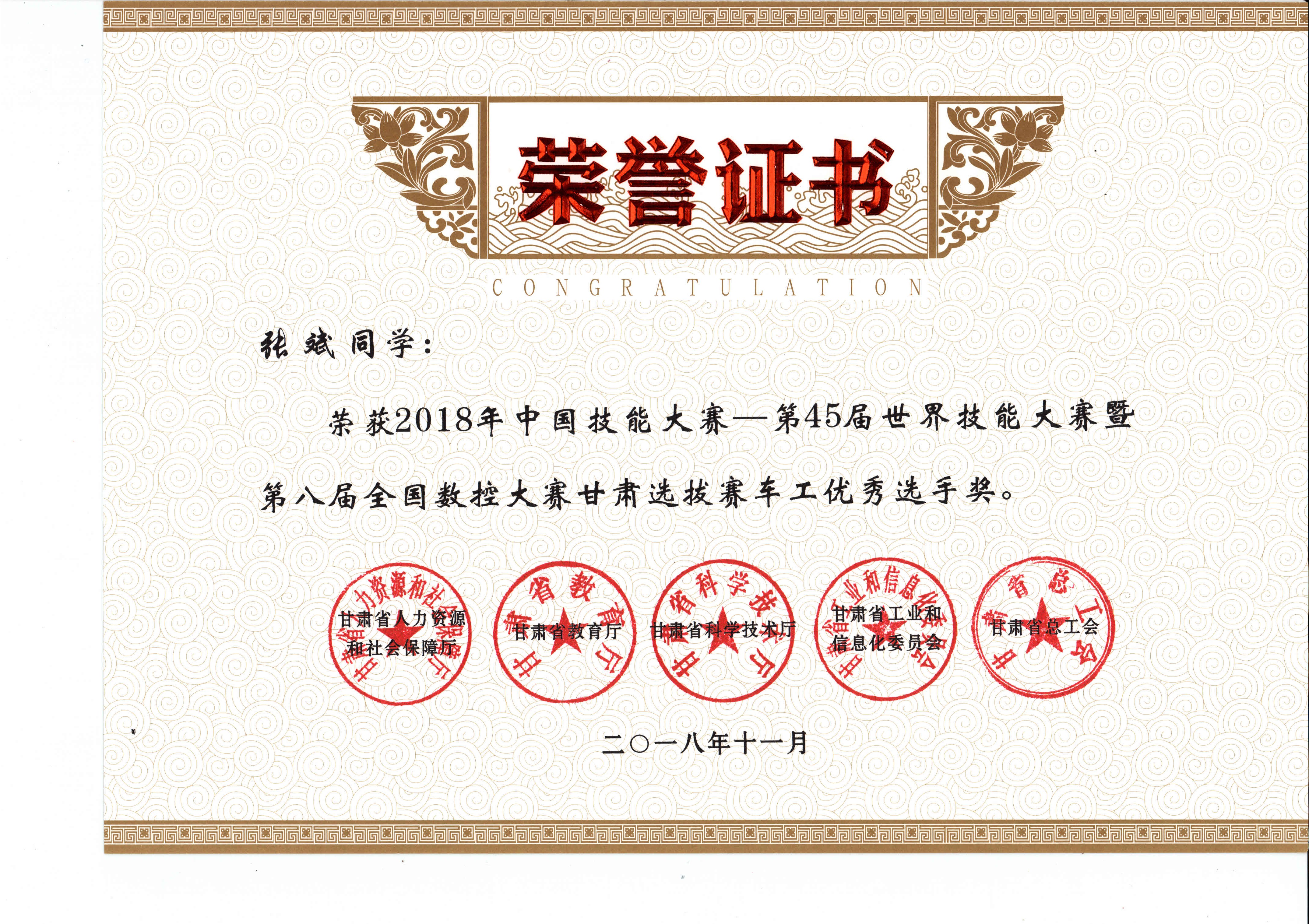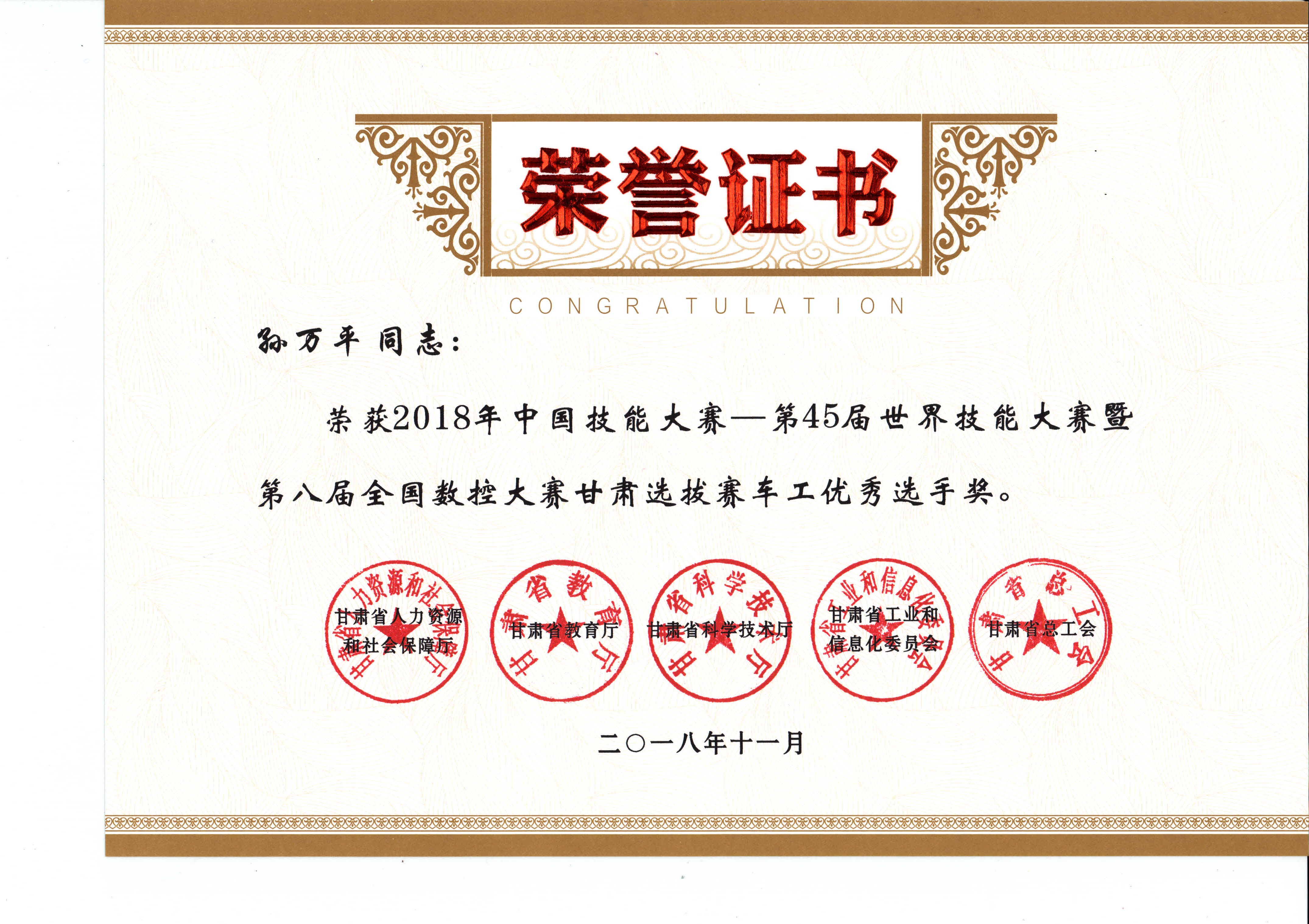 2018年中國技能大賽--第45屆世界技能大賽暨第八屆全國數(shù)控大賽甘肅選拔賽(車工項(xiàng)目)獲獎(jiǎng)證書