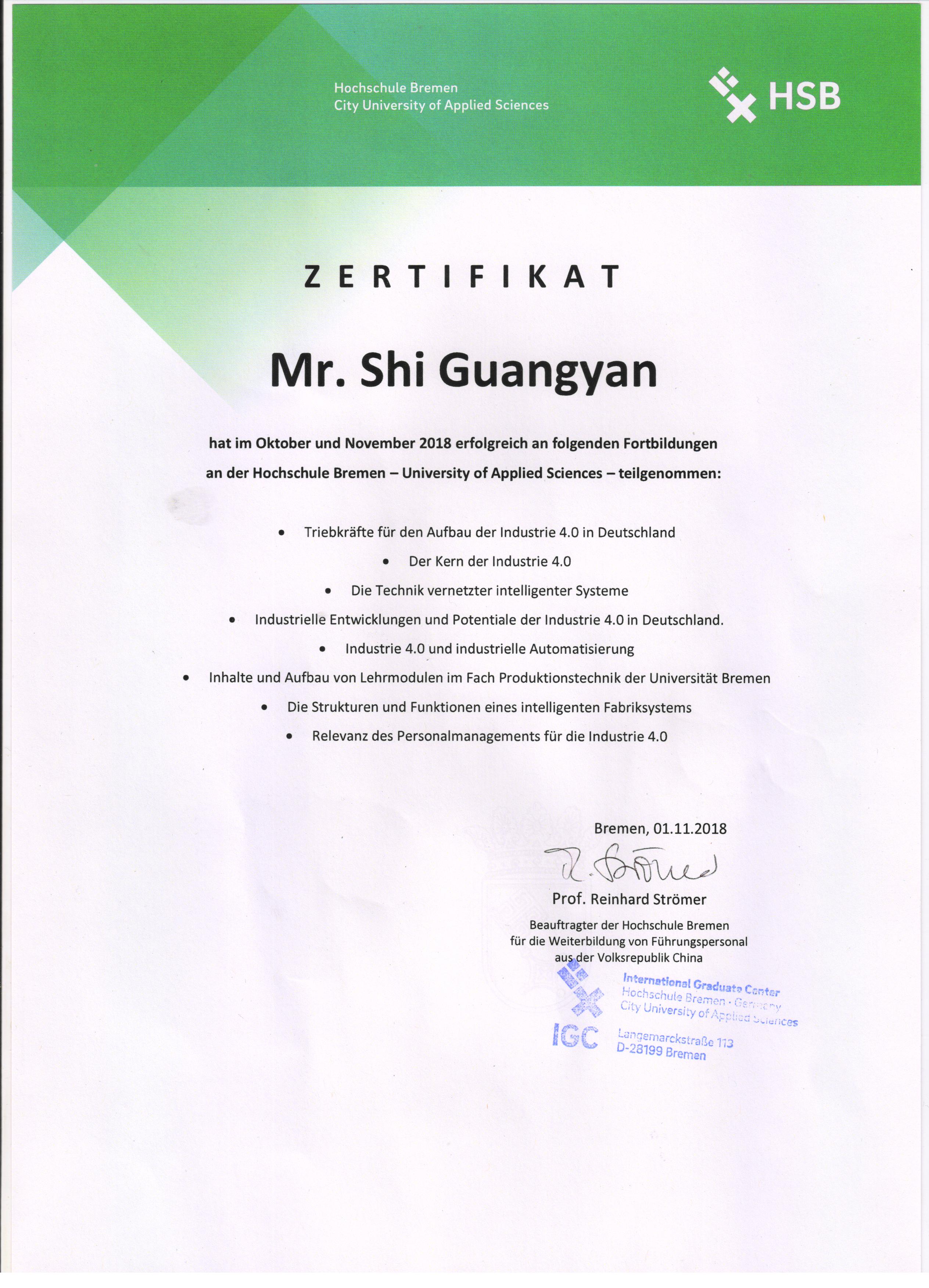 ?史光巖老師參加由甘肅省外專局組織的2018年出國(境)培訓(xùn)項目計劃,前往德國不萊梅應(yīng)用科技大學(xué)參加為期14天的“工業(yè)4.0工廠實驗室建設(shè)培訓(xùn)團(tuán)”。