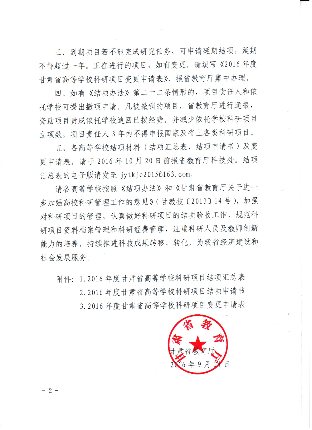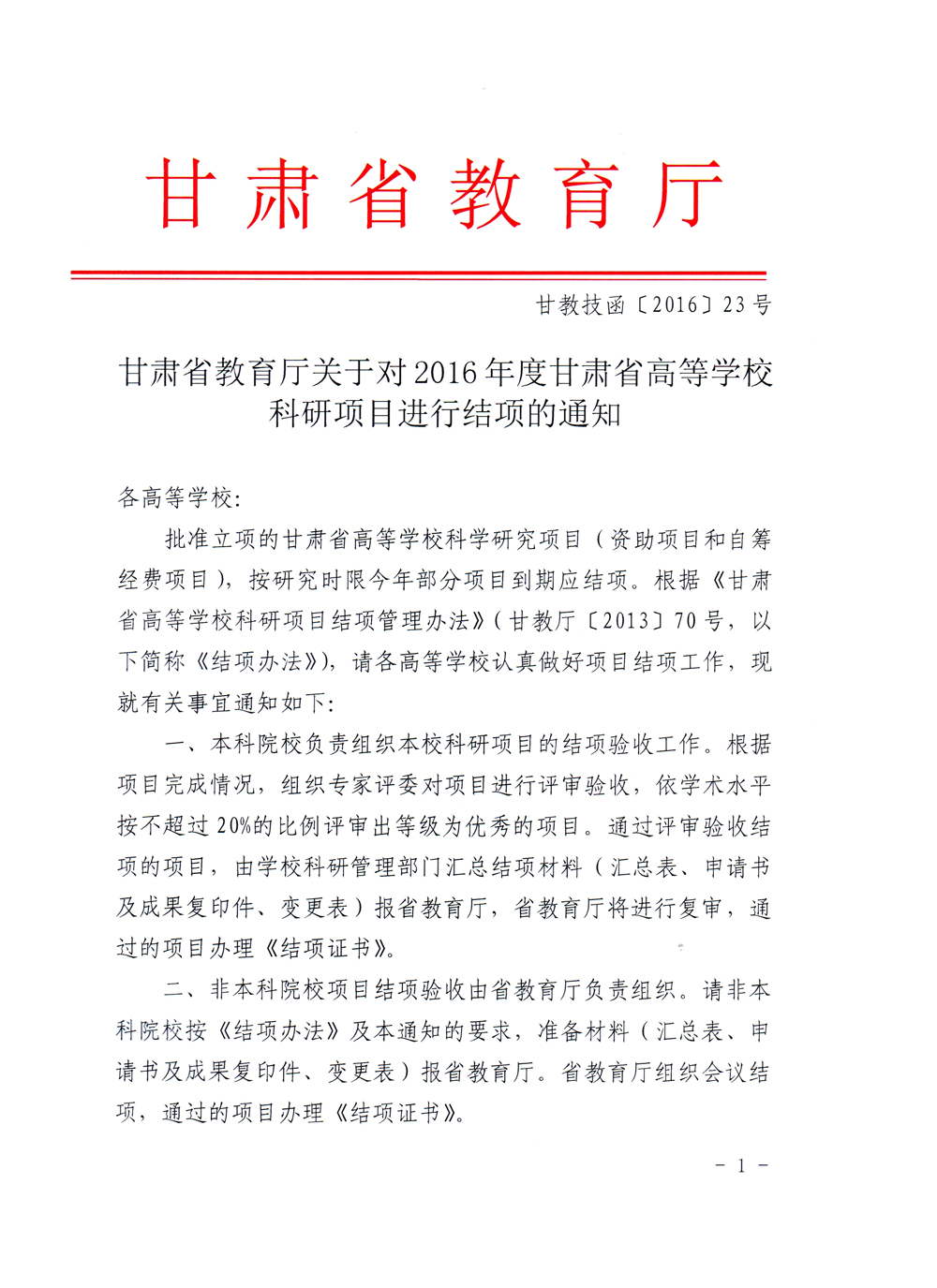 現(xiàn)轉(zhuǎn)發(fā)甘肅省教育廳《關(guān)于2016年度甘肅省高等學(xué)??蒲许?xiàng)目進(jìn)行結(jié)項(xiàng)的通知》(甘教技函〔2016〕23 號(hào)),請(qǐng)相關(guān)教師做好項(xiàng)目結(jié)題申報(bào)工作。截至日期2016年10月18日,請(qǐng)將符合要求的申報(bào)材料及相關(guān)電子文檔報(bào)學(xué)院科研處,逾期不再受理。