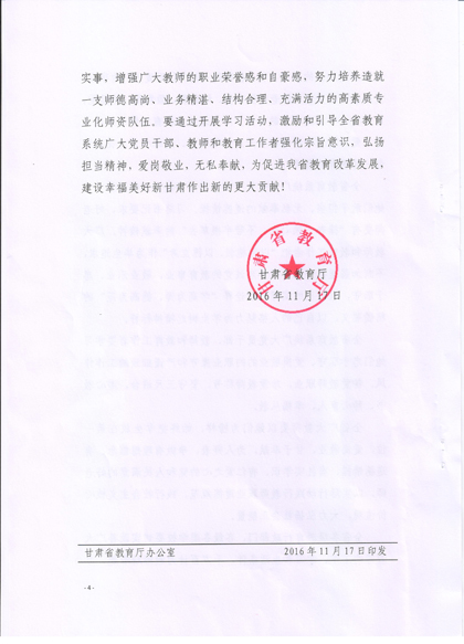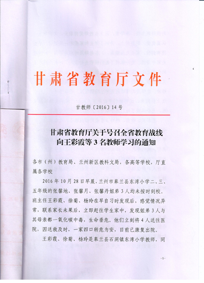 現(xiàn)將《甘肅省教育廳關(guān)于號(hào)召全省教育戰(zhàn)線(xiàn)向王彩霞等3名教師學(xué)習(xí)的通知》復(fù)印給你們,請(qǐng)認(rèn)真組織所屬教職工學(xué)習(xí)王彩霞、徐菊 、楊玲3名教師愛(ài)崗敬業(yè)、無(wú)私奉獻(xiàn)、愛(ài)心救人的先進(jìn)事跡。積極在院團(tuán)委、系團(tuán)總支,輔導(dǎo)員和班主任等學(xué)生管理隊(duì)伍中展開(kāi)學(xué)習(xí)研討活動(dòng),深入踐行社會(huì)主義核心價(jià)值觀,切實(shí)加強(qiáng)學(xué)院意識(shí)形態(tài)領(lǐng)域工作,唱響主旋律,大力弘揚(yáng)正能量。