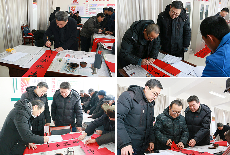 由學院黨委書記、院長趙明和分管幫扶工作副院長王永緒帶隊,一行50余人到達西靖鎮(zhèn)8號移民點、綠洲小城村委會會議室后,大家不顧冬日嚴寒,迅速各司其職、有條不紊地開展各項工作。學院書法教師們揮毫潑墨,一副副飽含著濃濃年味、寓意吉祥的春聯(lián)躍然紙上,村委會的會議室內(nèi)、村民廣場里四處洋溢著墨香的味道,桌子上、村民手里,到處都是大紅的對聯(lián)和“?!弊?,不少村民還主動要求在春聯(lián)里寫上新時代精神和精準扶貧的內(nèi)容,表達他們對黨和政府的深深感激之情。幫扶干部還為1號、3號、4號、8號、9號移民點的幫扶戶將寫好的春聯(lián)、書畫作品及新春的祝福送到了幫扶戶村民家中。