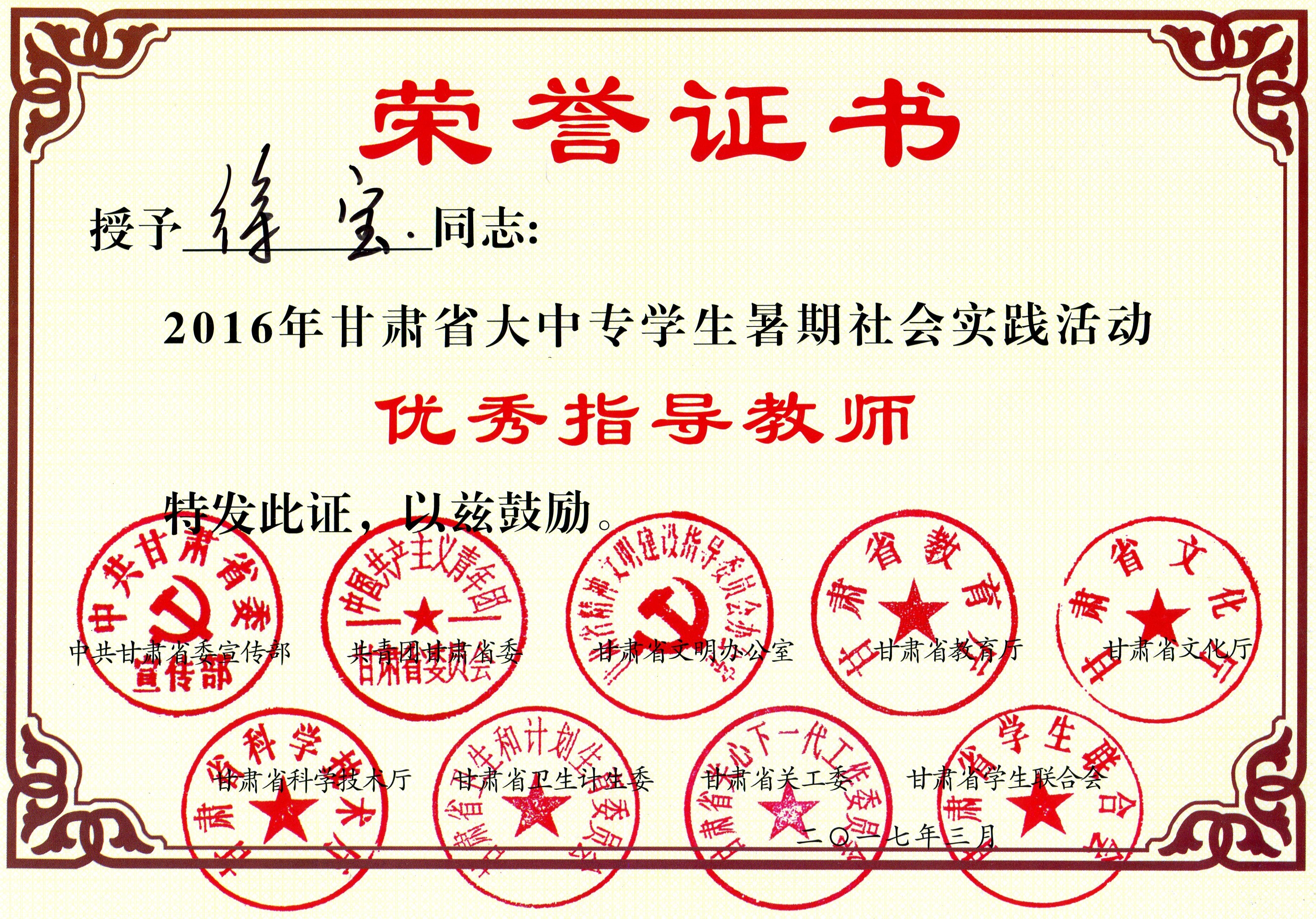 甘肅省大中專學(xué)生暑期社會實(shí)踐活動優(yōu)秀指導(dǎo)教師