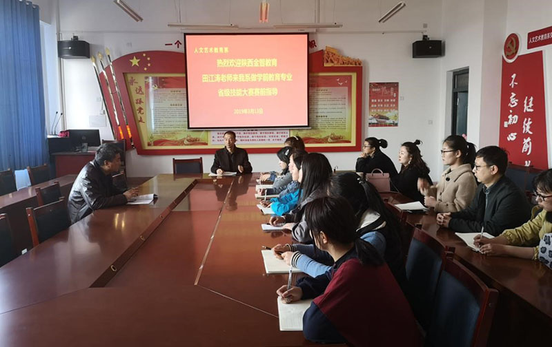 2019年3月13日下午,人文藝術(shù)教育系邀請(qǐng)陜西金智教育集團(tuán)講師、山西省“國(guó)培計(jì)劃”學(xué)前教育專(zhuān)業(yè)領(lǐng)域客座講師田江濤老師到我系進(jìn)行了學(xué)前教育專(zhuān)業(yè)省級(jí)技能大賽專(zhuān)題培訓(xùn)講座,并對(duì)2019年甘肅省職業(yè)院校學(xué)前教育專(zhuān)業(yè)技能比賽的流程進(jìn)行了指導(dǎo)。系副主任李欣、各專(zhuān)業(yè)教師及參賽學(xué)生參加。