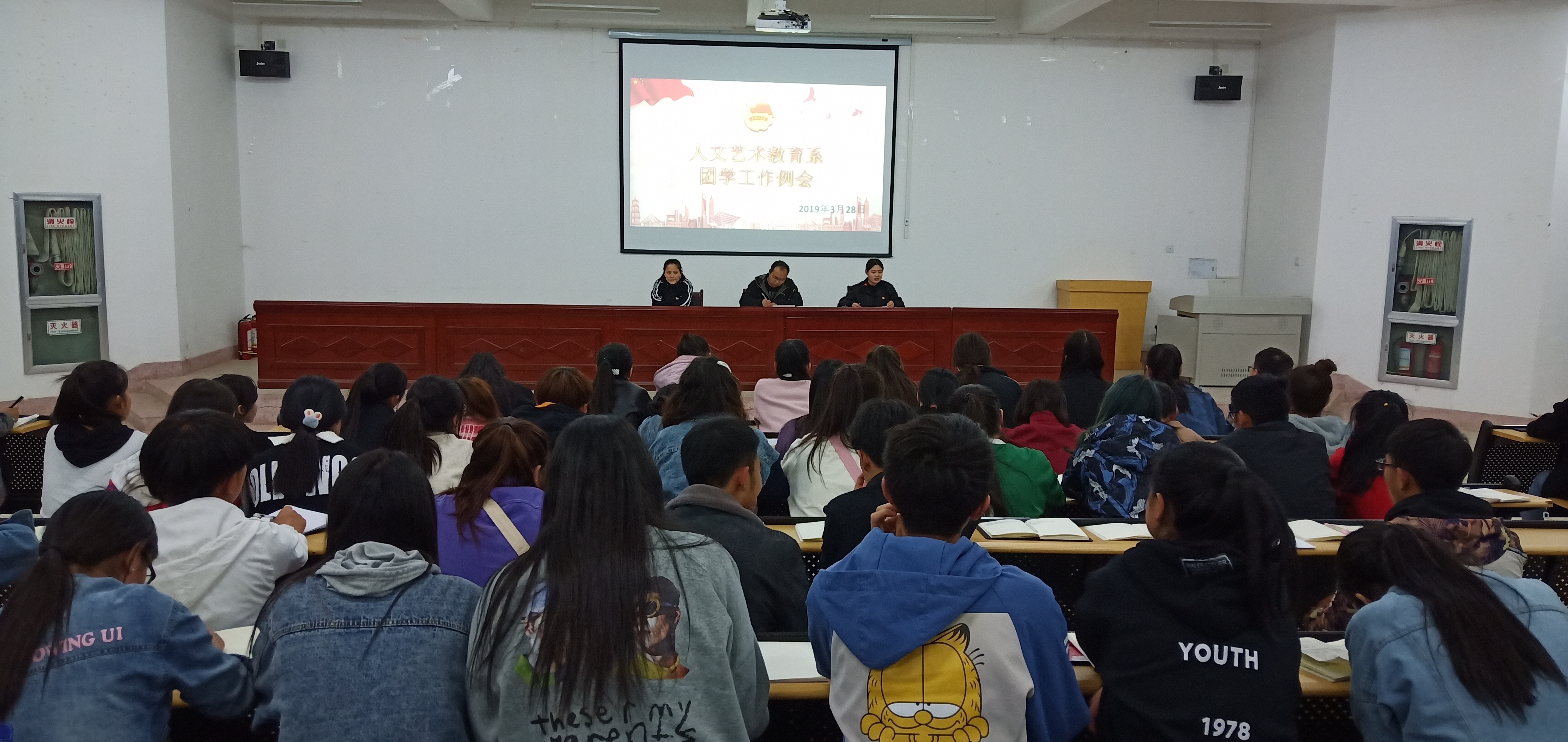 ? ? ? ?3月28日晚,人文藝術(shù)教育系在勵(lì)勤樓階梯教室召開了三月份工作例會(huì),人文藝術(shù)教育系分團(tuán)委書記唐鑫基老師、分團(tuán)委全體學(xué)生干部,干事、17、18級(jí)各班班委共一百余人參加會(huì)議。會(huì)議安排部署了本學(xué)期分團(tuán)委共青團(tuán)常規(guī)工作和重點(diǎn)工作,討論通過(guò)了《人文藝術(shù)教育系2019年基層共青團(tuán)考核細(xì)則》。