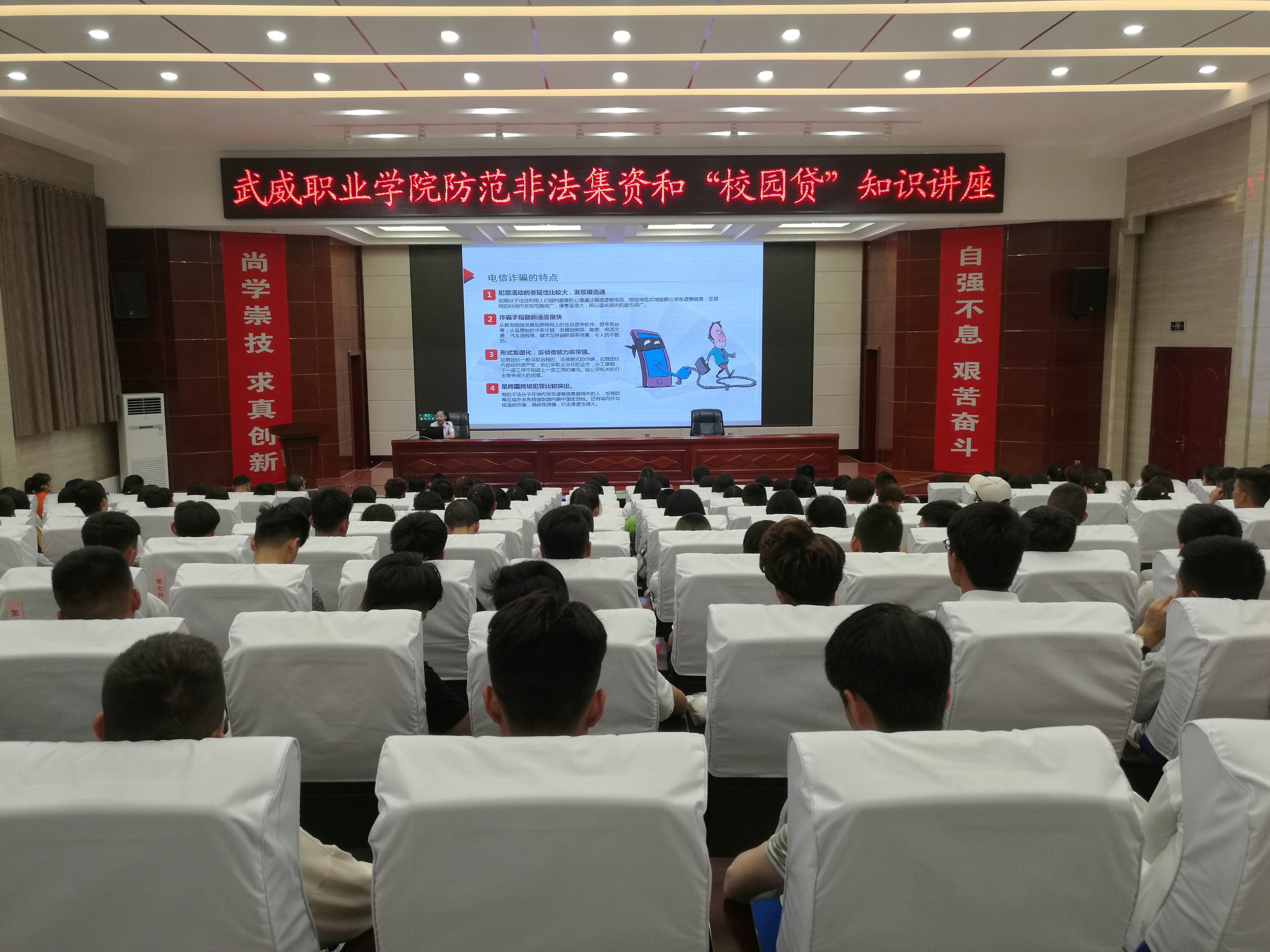 為深入貫徹落實(shí)甘肅省2019年防范非法集資和金融領(lǐng)域掃黑除惡宣傳月活動的有關(guān)精神,保護(hù)廣大師生的合法權(quán)益。6月9日晚,學(xué)院邀請中國農(nóng)業(yè)銀行武威支行風(fēng)險(xiǎn)管理部工作人員朱琳在學(xué)院菁英廳作了關(guān)于防范非法集資和校園貸知識講座,學(xué)院副院長王永緒出席活動,保衛(wèi)處、計(jì)劃財(cái)務(wù)處負(fù)責(zé)同志及各系師生代表200余人聆聽了講座。
