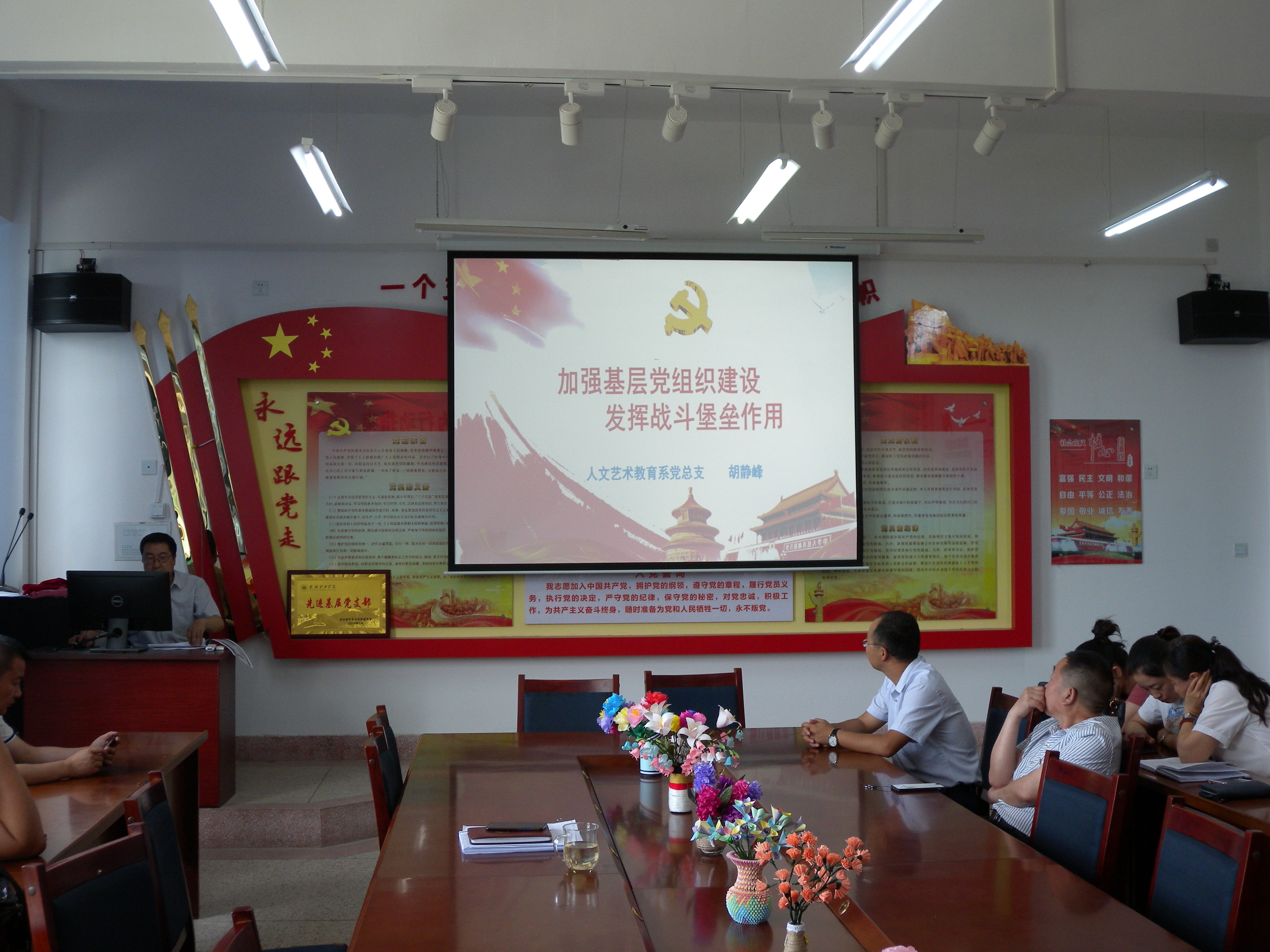 為慶祝中國(guó)共產(chǎn)黨建黨98周年,進(jìn)一步凝聚黨員力量,振奮黨員精神,更好地發(fā)揮黨員先鋒模范作用,7月1日下午,人文藝術(shù)教育系黨總支開展了書記講黨課活動(dòng),系黨總支全體黨員、預(yù)備黨員參加了活動(dòng)。