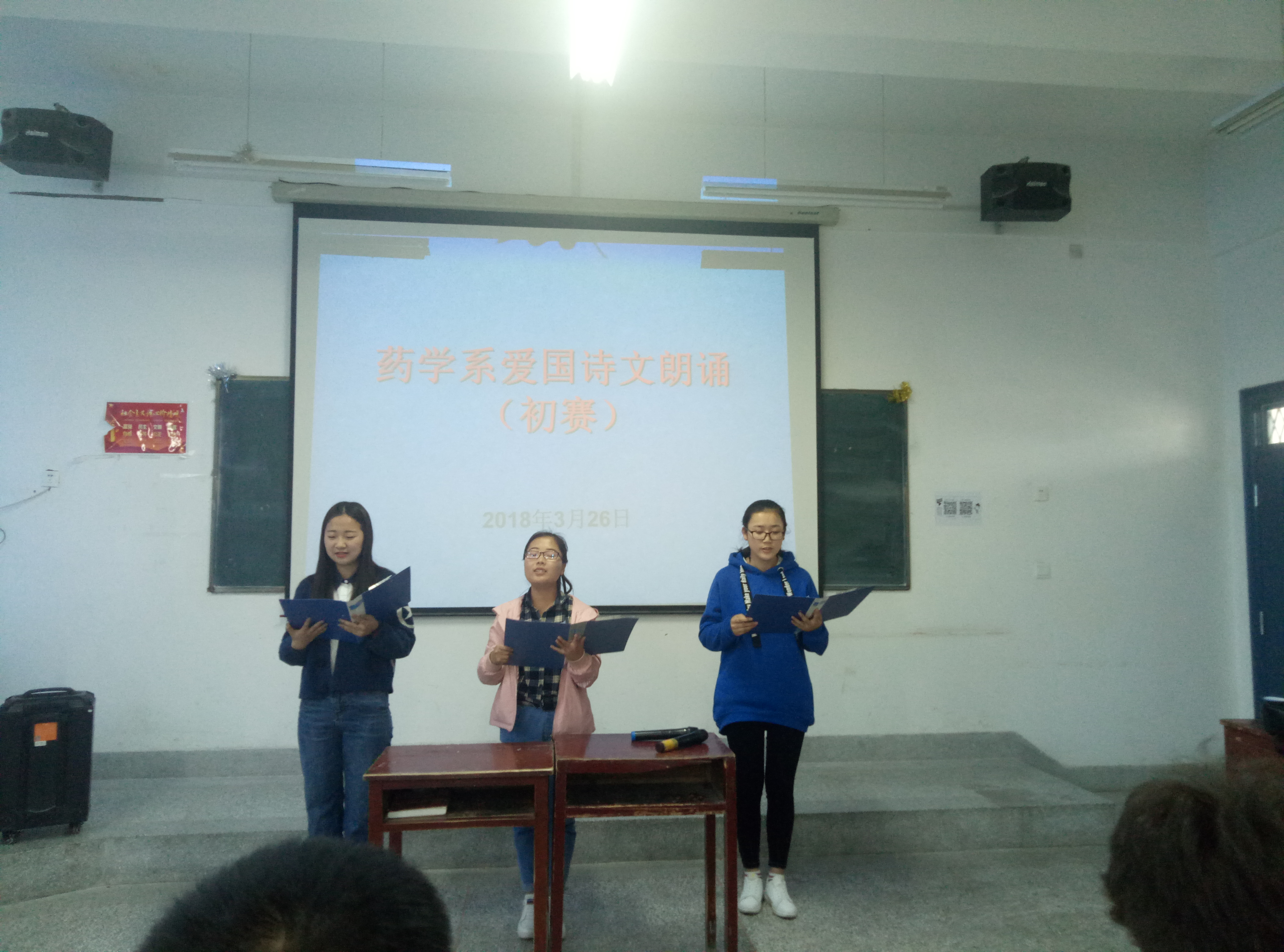 為深入學(xué)習(xí)貫徹習(xí)近平新時(shí)代中國(guó)特色社會(huì)主義思想和黨的十九大精神,鼓勵(lì)當(dāng)代大學(xué)生通過(guò)朗誦愛(ài)國(guó)詩(shī)文,感受中華經(jīng)典文化,塑造民族精神,展現(xiàn)新時(shí)期大學(xué)生精神風(fēng)貌,藥學(xué)系團(tuán)總支在系黨總支的安排和學(xué)院團(tuán)委的指導(dǎo)下,于3月26日在明遠(yuǎn)樓524教室舉辦了“我的中國(guó)夢(mèng)”經(jīng)典愛(ài)國(guó)詩(shī)文朗誦比賽。藥學(xué)系16級(jí)、17級(jí)各班學(xué)生代表參加了此次朗誦比賽。