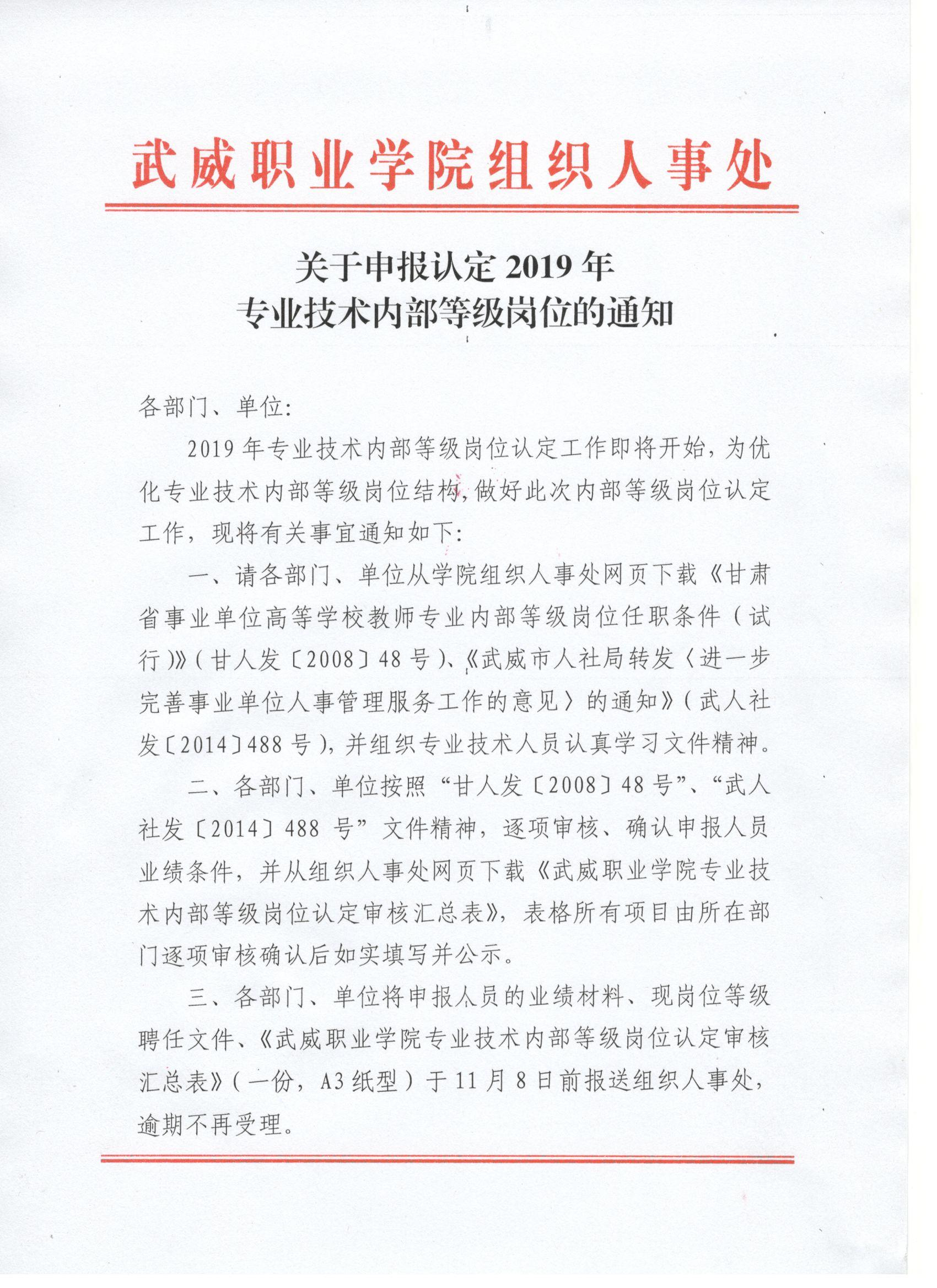 關(guān)于申報認定2019年專業(yè)技術(shù)內(nèi)部等級崗位的通知