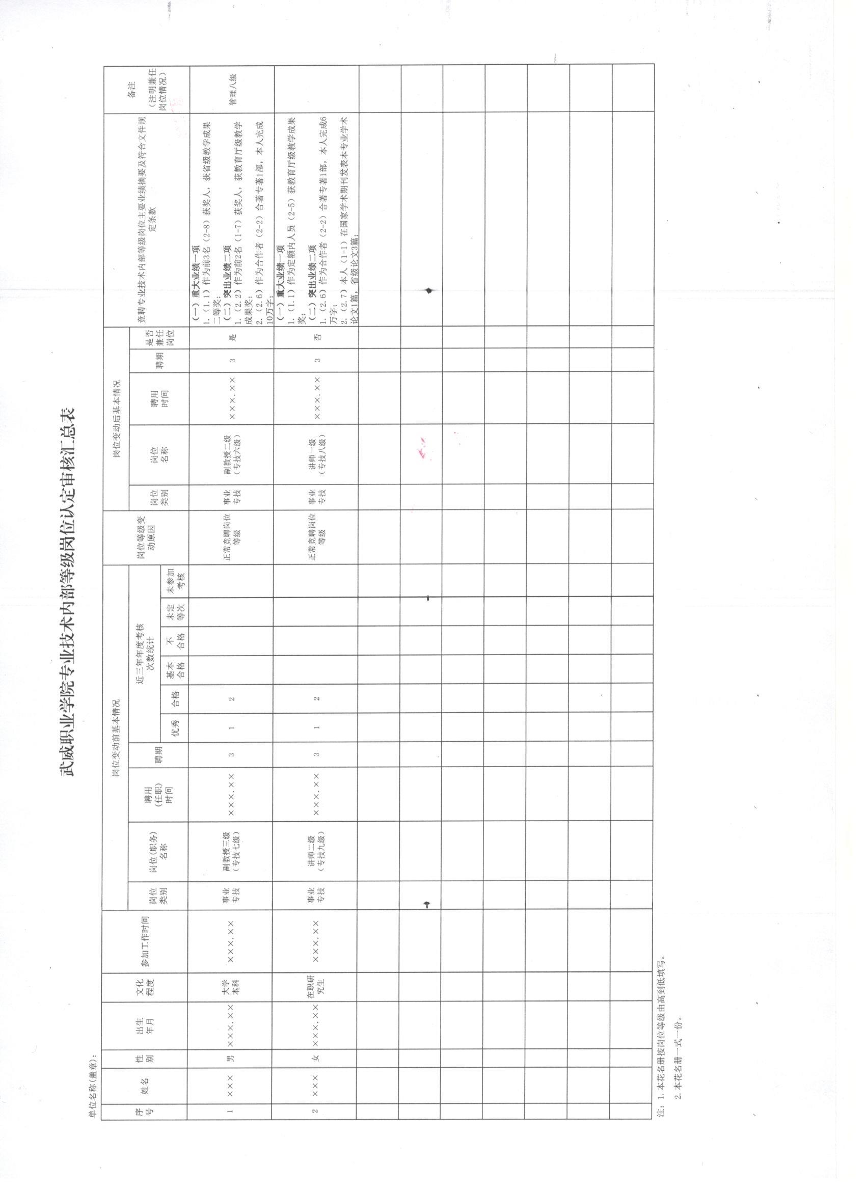 武威職業(yè)學(xué)院專業(yè)技術(shù)內(nèi)部等級崗位認定審核匯總表2019 - 樣表