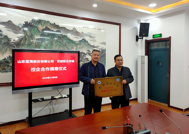 在捐贈儀式上,楊兆永總經(jīng)理介紹了山東藍海股份有限公司做了介紹,雙方在人才需求、專業(yè)課程設(shè)置開發(fā)、雙師型師資培養(yǎng)、教學(xué)組織實習(xí)質(zhì)量評估、就業(yè)服務(wù)等多方面合作近十年,已經(jīng)將校企雙方緊密聯(lián)合在一起,同時希望今后繼續(xù)不斷在師資隊伍培養(yǎng)、人才培養(yǎng)、教育教學(xué)繼續(xù)加強合作,實現(xiàn)雙贏,共同發(fā)展。