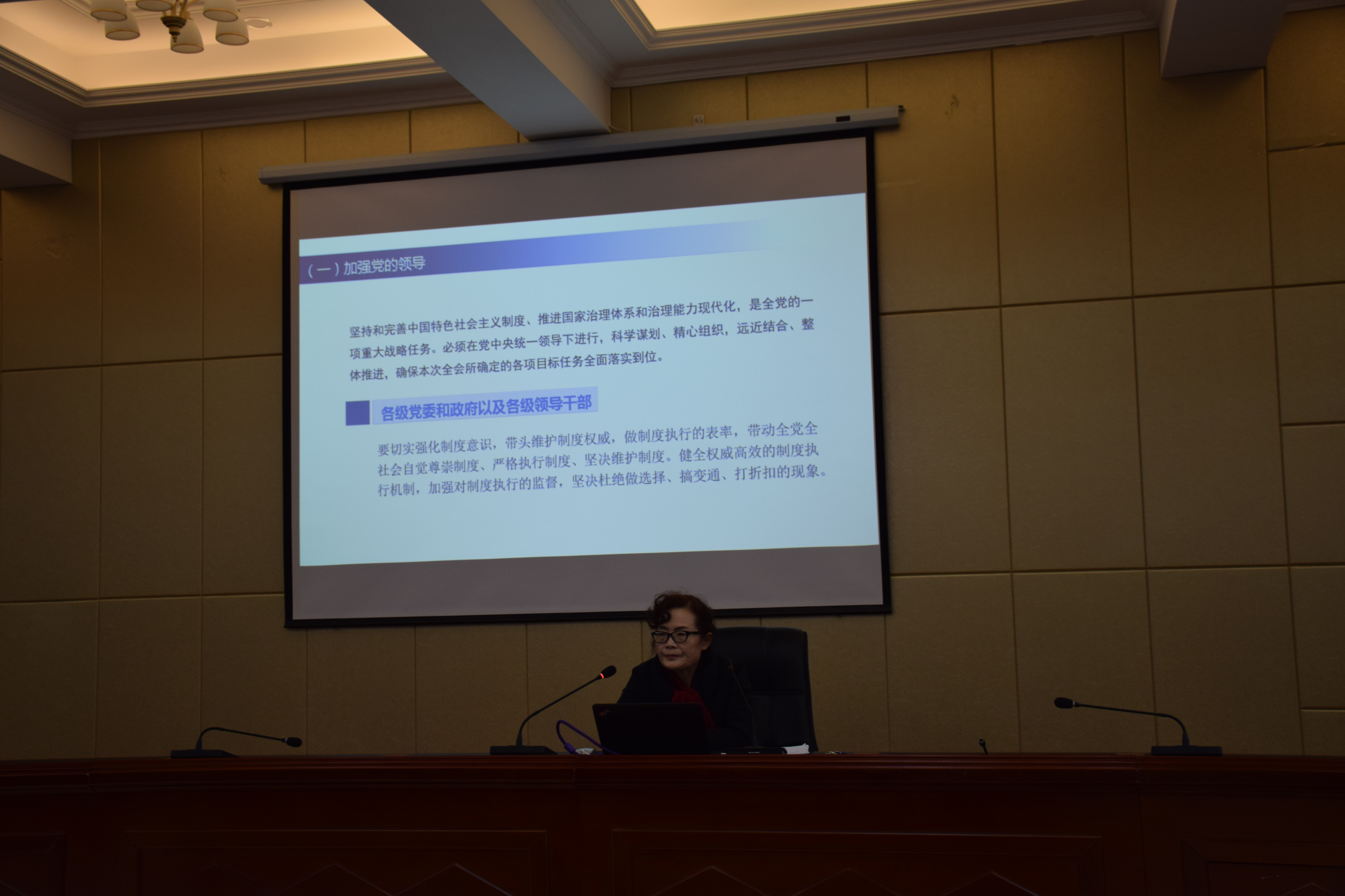 晏素珍以《中共中央關(guān)于堅持和完善中國特色社會主義制度推進國家治理體系和治理能力現(xiàn)代化若干重大問題的決定》的學習與解讀為題,重點就全會召開的背景、意義和看點;《決定》的基本框架和主要內(nèi)容以及抓好全會的學習貫徹的具體要求進行了宣講。要求廣大師生提高政治站位,樹牢“四個意識”,堅定“四個自信”,做到“兩個維護”,推動全會精神在全系落地生根、取得扎實成效。為實現(xiàn)“兩個一百年”奮斗目標,實現(xiàn)中華民族偉大復興的中國夢而努力奮斗。
