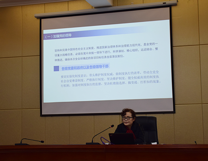 晏素珍以《中共中央關(guān)于堅(jiān)持和完善中國(guó)特色社會(huì)主義制度推進(jìn)國(guó)家治理體系和治理能力現(xiàn)代化若干重大問題的決定》的學(xué)習(xí)與解讀為題,重點(diǎn)就全會(huì)召開的背景、意義和看點(diǎn);《決定》的基本框架和主要內(nèi)容以及抓好全會(huì)的學(xué)習(xí)貫徹的具體要求進(jìn)行了宣講。要求廣大師生提高政治站位,樹牢“四個(gè)意識(shí)”,堅(jiān)定“四個(gè)自信”,做到“兩個(gè)維護(hù)”,推動(dòng)全會(huì)精神在全系落地生根、取得扎實(shí)成效。為實(shí)現(xiàn)“兩個(gè)一百年”奮斗目標(biāo),實(shí)現(xiàn)中華民族偉大復(fù)興的中國(guó)夢(mèng)而努力奮斗。
