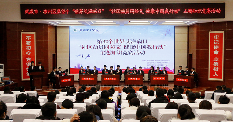 為持續(xù)深入推進(jìn)大學(xué)生艾滋病預(yù)防教育工作,迎接第32個(gè)世界艾滋病日的到來(lái), 12月1日晚,學(xué)院開展了艾滋病知識(shí)競(jìng)賽活動(dòng),學(xué)院副院長(zhǎng)王永緒、王守云,市疾控中心領(lǐng)導(dǎo)參加活動(dòng)。此次活動(dòng)由武威職業(yè)學(xué)院與武威市疾控中心聯(lián)合主辦,護(hù)理系承辦,活動(dòng)的主題為“社區(qū)動(dòng)員同防艾 .健康中國(guó)我行動(dòng)”。學(xué)院團(tuán)委及部分系老師,各系學(xué)生代表觀看了比賽。
