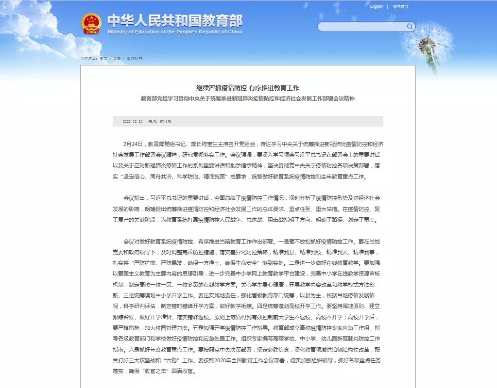 2月24日,教育部黨組書記、部長陳寶生主持召開黨組會(huì),提出各地要以縣為主,根據(jù)當(dāng)?shù)匾咔榘l(fā)展情況,科學(xué)研判評估,制定中小學(xué)錯(cuò)時(shí)錯(cuò)峰開學(xué)方案,做好教學(xué)銜接。原則上疫情得到有效控制前大學(xué)生不返校、高校不開學(xué);高校開學(xué)后,要嚴(yán)格措施,加大校園管理力度。