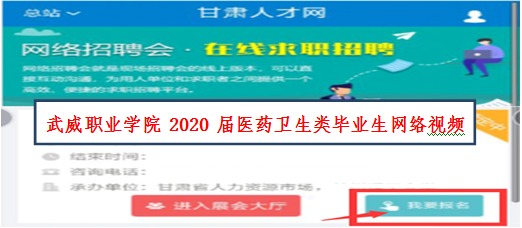 1.登錄甘肅人才網(wǎng)(www.gszhaopin.com),點(diǎn)擊菜單欄“招聘會”—“網(wǎng)絡(luò)招聘會”進(jìn)入二級頁面菜單,進(jìn)入網(wǎng)絡(luò)招聘會列表—選擇“武威職業(yè)學(xué)院2020屆醫(yī)藥衛(wèi)生類畢業(yè)生網(wǎng)絡(luò)視頻雙選會”點(diǎn)擊“我要報(bào)名”按鈕,登錄企業(yè)后臺(無賬號點(diǎn)擊“立即注冊”,資質(zhì)通過審核后再報(bào)名),待定審核。