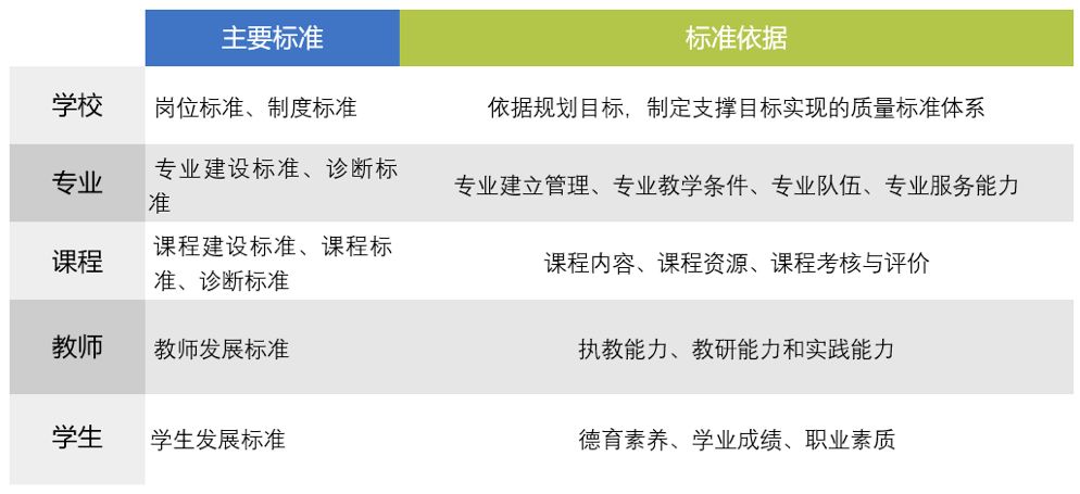 標(biāo)準(zhǔn)制定要體現(xiàn)多元質(zhì)量觀,采用剛性與柔性相結(jié)合的辦法,解決特色發(fā)展與創(chuàng)新發(fā)展的問題,堅(jiān)持“目標(biāo)導(dǎo)向與問題導(dǎo)向”的統(tǒng)一。從實(shí)際出發(fā),查找問題、研究問題、解決問題,重點(diǎn)解決學(xué)校內(nèi)部治理中存在的“透明管理”等突出問題;從專業(yè)建立管理、專業(yè)教學(xué)條件、專業(yè)隊(duì)伍、專業(yè)服務(wù)能力等維度制定專業(yè)建設(shè)標(biāo)準(zhǔn)和診斷標(biāo)準(zhǔn);從課程內(nèi)容、課程資源、課程考核與評價(jià)等維度制定課程建設(shè)標(biāo)準(zhǔn)、課程標(biāo)準(zhǔn)和課程診斷標(biāo)準(zhǔn);教師發(fā)展標(biāo)準(zhǔn)要以提升教師的執(zhí)教能力、教研能力和實(shí)踐能力為要素;學(xué)生發(fā)展標(biāo)準(zhǔn)要重點(diǎn)考慮學(xué)生的德育素養(yǎng)、學(xué)業(yè)成績、職業(yè)素質(zhì)。通過標(biāo)準(zhǔn)體系的打造,形成學(xué)校內(nèi)部質(zhì)量保證體系的標(biāo)準(zhǔn)鏈。