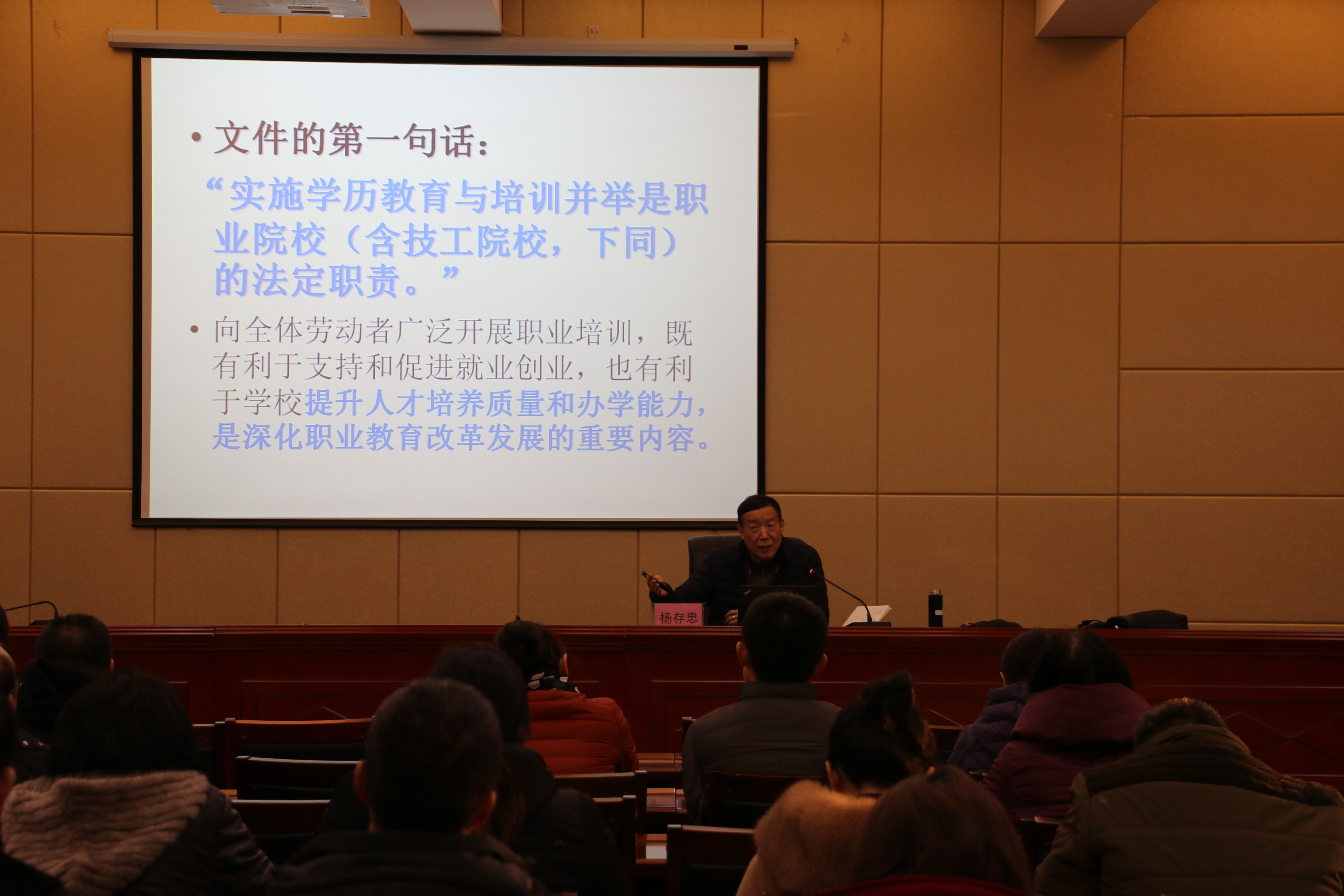 針對教育部11月25日發(fā)布的“關(guān)于做好《職業(yè)院校全面開展職業(yè)培訓 促進就業(yè)創(chuàng)業(yè)行動計劃》實施工作有關(guān)事項的通知”的文件(以下簡稱《行動計劃》),楊教授從《行動計劃》出臺的背景和意義、職業(yè)院校的法定職責、職業(yè)院校普遍存在的問題、《行動計劃》對職業(yè)院校提出的重點任務和行動措施以及如何推進貫徹落實《行動計劃》等五個方面和大家進行了學習分享。楊教授強調(diào),深化職業(yè)教育改革發(fā)展,職業(yè)院校敞開校門,廣泛開展培訓工作,服務社會發(fā)展,是職業(yè)院校的法定責任,也是學院可持續(xù)發(fā)展和生存的必然趨勢?!缎袆佑媱潯穼β殬I(yè)院校提出了十個方面的行動措施一是廣泛開展企業(yè)職工技能培訓。二是積極開展面向重點人群的就業(yè)創(chuàng)業(yè)培訓。三是大力開展失業(yè)人員再就業(yè)培訓。四是做好職業(yè)指導和就業(yè)服務。五是推進培訓資源建設(shè)和模式改革。六是加強培訓師資隊伍建設(shè)。七是支持多方合作共建培訓實訓基地。八是完善職業(yè)院校開展培訓的激勵政策。九是健全參訓人員的支持鼓勵政策。十是建立培訓評價與考核機制。楊教授希望大家能夠?qū)W好文件并認真思考學院的改革發(fā)展。把立德樹人、服務發(fā)展、促進就業(yè)、適應需求的辦學理念傳承下去。
