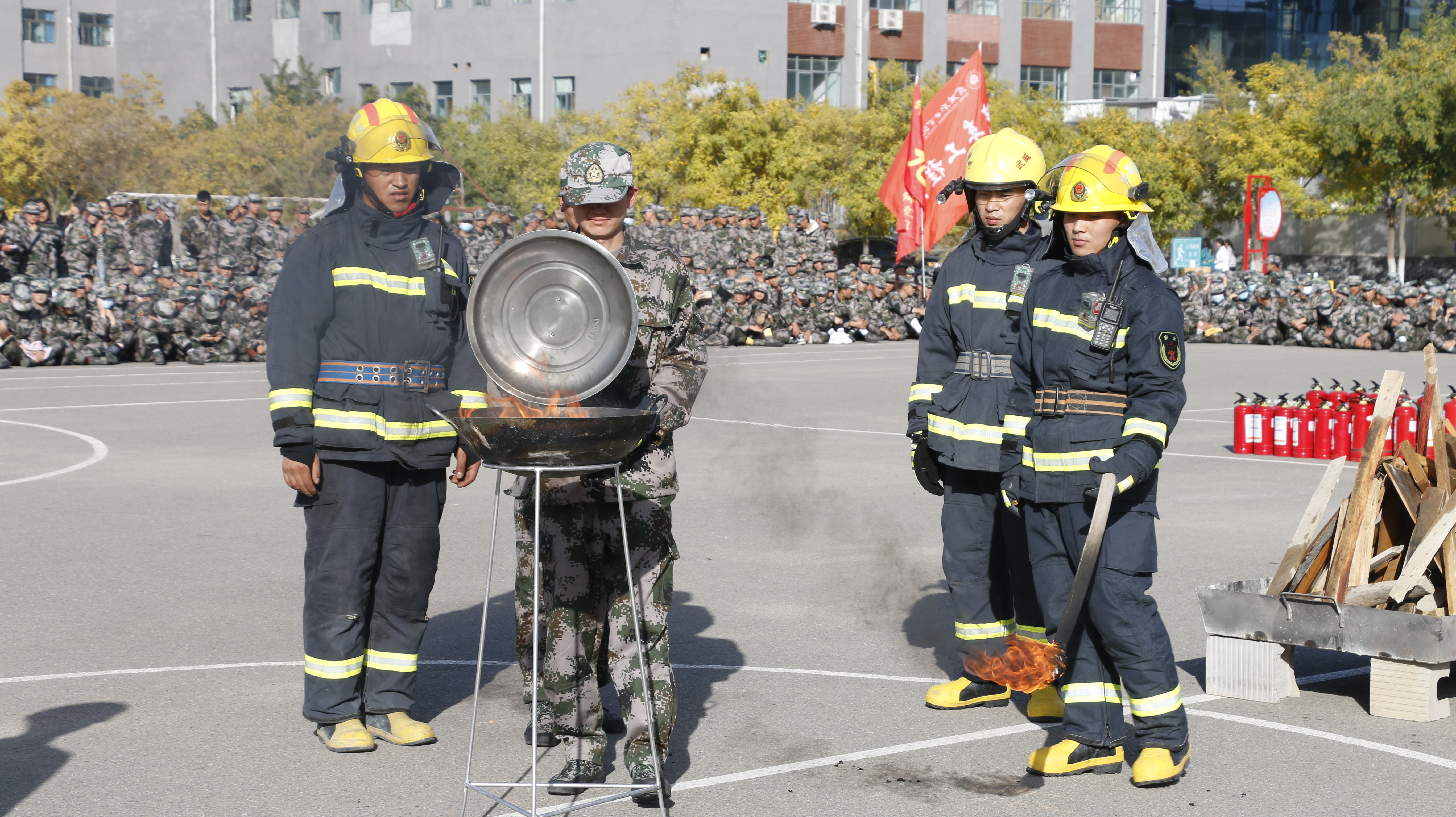 隨后,2020級(jí)全體新生整隊(duì)到操場(chǎng)參加了滅火演練。在消防救援中隊(duì)指戰(zhàn)員的講解和示范下,同學(xué)們學(xué)習(xí)了應(yīng)急逃生、火災(zāi)報(bào)警和滅火器使用等消防安全常識(shí),學(xué)生代表體驗(yàn)了處置液化氣瓶滅火、油鍋滅火、干粉滅火器滅火等操作,在實(shí)戰(zhàn)中提高了消防應(yīng)急能力。