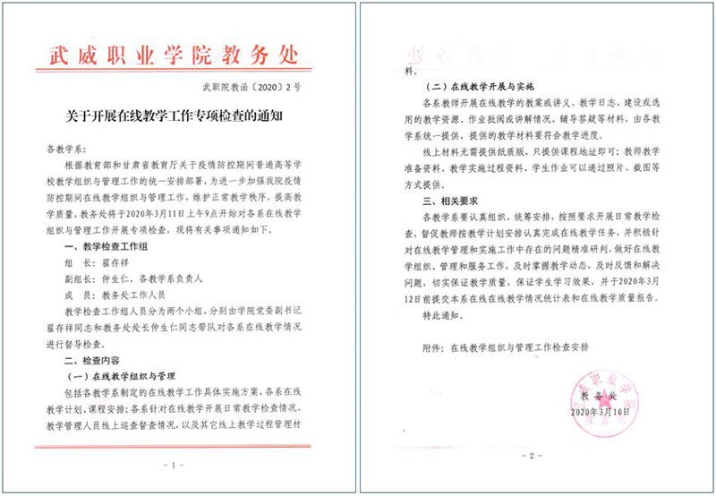 各院系及相關部門要按照教育部和省教育廳關于疫情防控期間在線教學工作的文件精神和《武威職業(yè)學院新型冠狀病毒肺炎疫情防控期間在線教學工作實施方案》的相關要求進行全面自查,做到文件精神及要求全部落實到位、不打折扣;對執(zhí)行情況進行認真總結,通過自查深入挖掘現(xiàn)階段在線教學實施和組織管理過程中的重點問題,利用各系教研活動和教研團隊推動開展教學研究和人才培養(yǎng)模式改革研究,全面落實問題導向,推動在線教學工作落實落細落地。