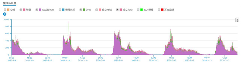 從學院在線教學平臺管理數(shù)據(jù)看,在線教學第三周內(nèi)教學資源學生訪問量達到了983990人次,學生到課134631人次,完成課后作業(yè)649次,上交學生44266人次。各門課程學習任務完成率普遍有所提高,大多數(shù)課程按照教學計劃進度學生學習完成率已全部達到100%。