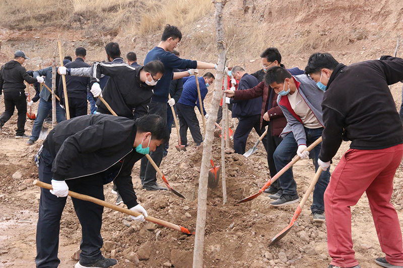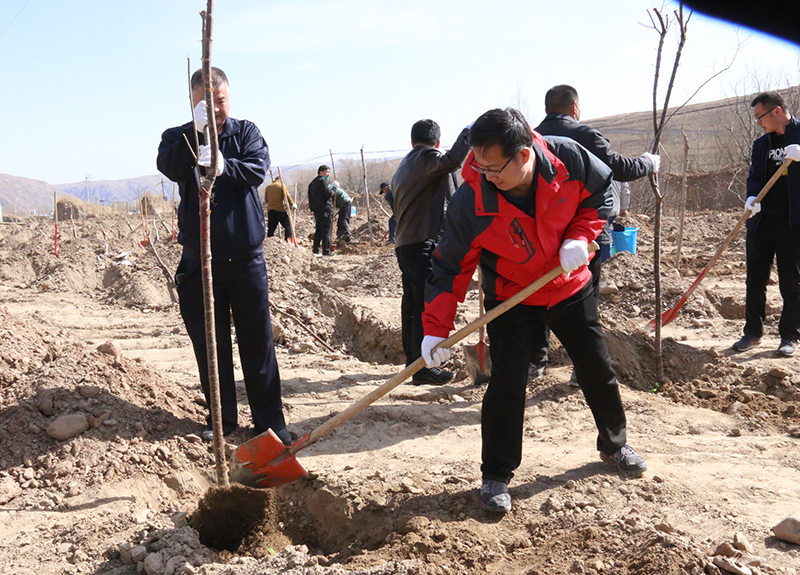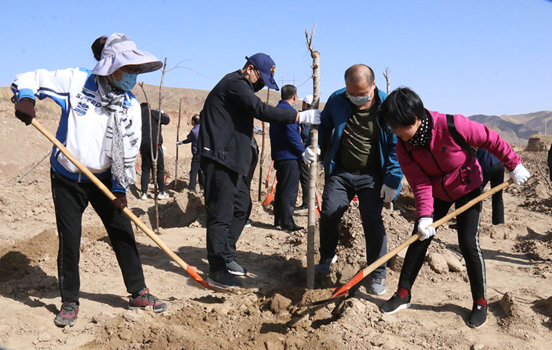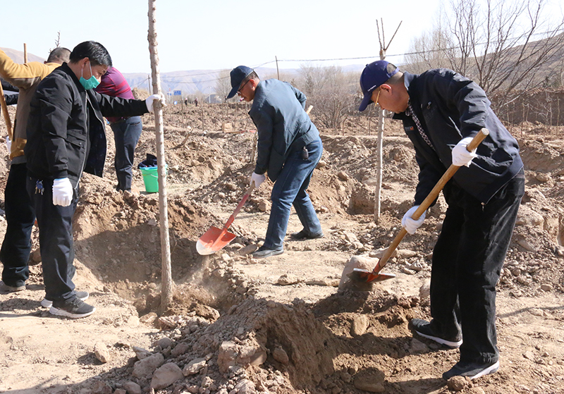 春風(fēng)吹拂處,新綠綻枝頭。為深入學(xué)習(xí)貫徹習(xí)近平總書記視察甘肅的重要講話和批示精神,認(rèn)真踐行綠水青山就是金山銀山的發(fā)展理念,實(shí)施綠色發(fā)展戰(zhàn)略,進(jìn)一步加強(qiáng)祁連山生態(tài)環(huán)境保護(hù)與治理,幫助幫扶鎮(zhèn)打贏脫貧攻堅(jiān)戰(zhàn),實(shí)施鄉(xiāng)村振興戰(zhàn)略,4月9日,學(xué)院領(lǐng)導(dǎo)班子成員、幫扶干部、駐村干部及部分教職工70多人深入結(jié)對(duì)幫扶鎮(zhèn)——黑松驛鎮(zhèn)開展義務(wù)植樹活動(dòng),建設(shè)“生態(tài)示范林”。春光沐浴的祁連山腳下黑松驛鎮(zhèn),春意盎然,生機(jī)勃勃,正是植樹好時(shí)節(jié)。廣大教職工一下車就拿起鐵鍬到植樹現(xiàn)場,與黑松驛鎮(zhèn)政府部分干部一起投入植樹活動(dòng),按照“橫看直線側(cè)一線、三埋兩踩一提苗”的技術(shù)要求,三人一組,分工協(xié)作,有序配合,揮鍬培土、扶苖踩土、圍堰澆水,現(xiàn)場一派熱火朝天的勞動(dòng)景象。當(dāng)天植樹育林約20余畝,一棵棵新栽的樹苗整齊排列,迎風(fēng)挺立。通過義務(wù)植樹,廣大教職工用實(shí)際行動(dòng)傳播著生態(tài)文明、綠色發(fā)展理念,切實(shí)幫助幫扶鎮(zhèn)綠起來,美起來,富起來。