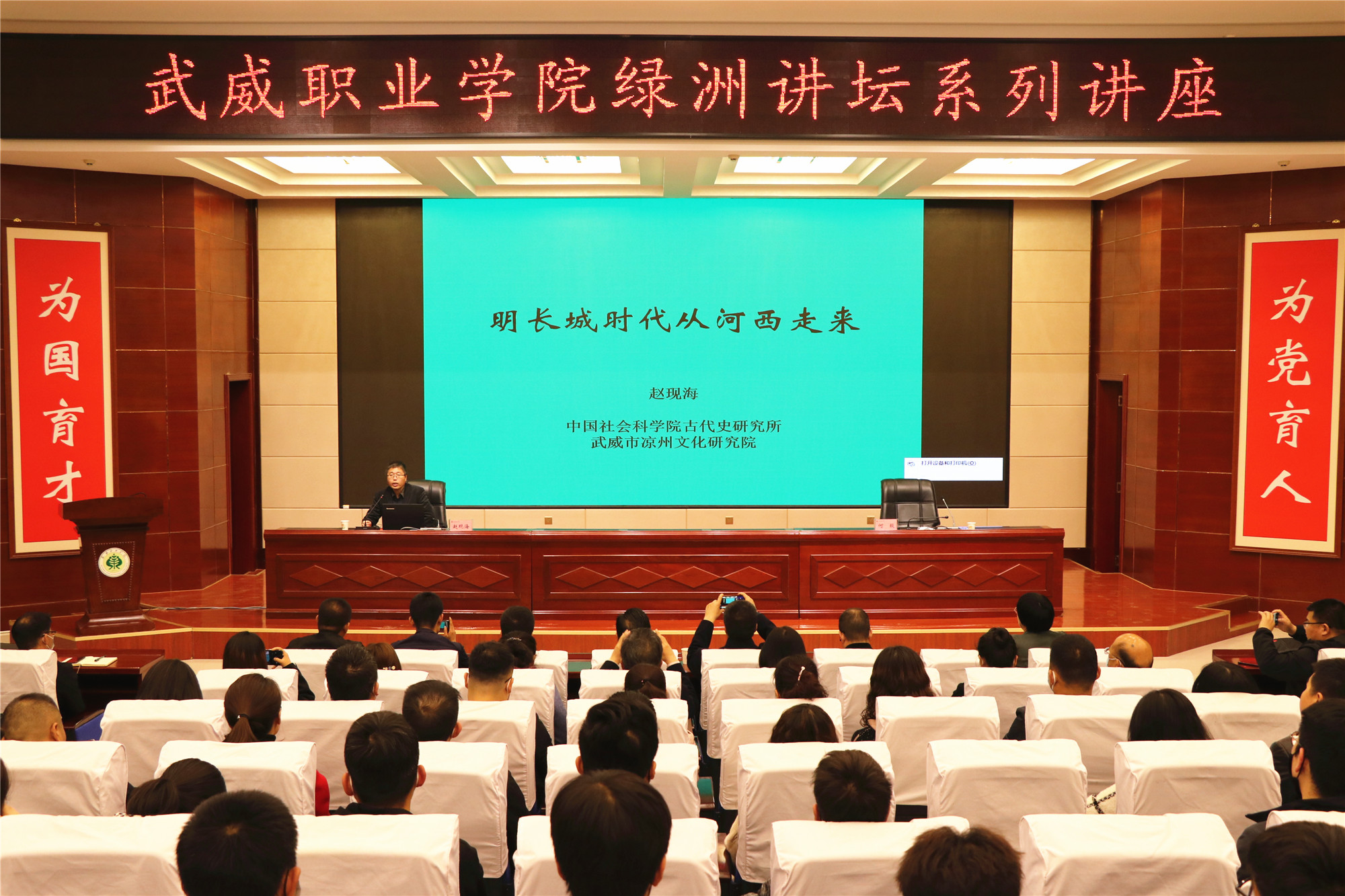 4月2日,學(xué)院綠洲講壇第40期開(kāi)講,由中國(guó)社會(huì)科學(xué)院古代史研究所研究員,明史研究室主任,市涼州文化研究院副院長(zhǎng)趙現(xiàn)海同志為師生進(jìn)行《明長(zhǎng)城時(shí)代從河西走來(lái)》的專題報(bào)告。學(xué)院領(lǐng)導(dǎo)、涼州文化研究院相關(guān)領(lǐng)導(dǎo)和工作人員,西關(guān)科技巷社區(qū)領(lǐng)導(dǎo)和學(xué)院師生代表220人參加了報(bào)告會(huì)。黨委委員、副院長(zhǎng)何毅主持報(bào)告會(huì)。