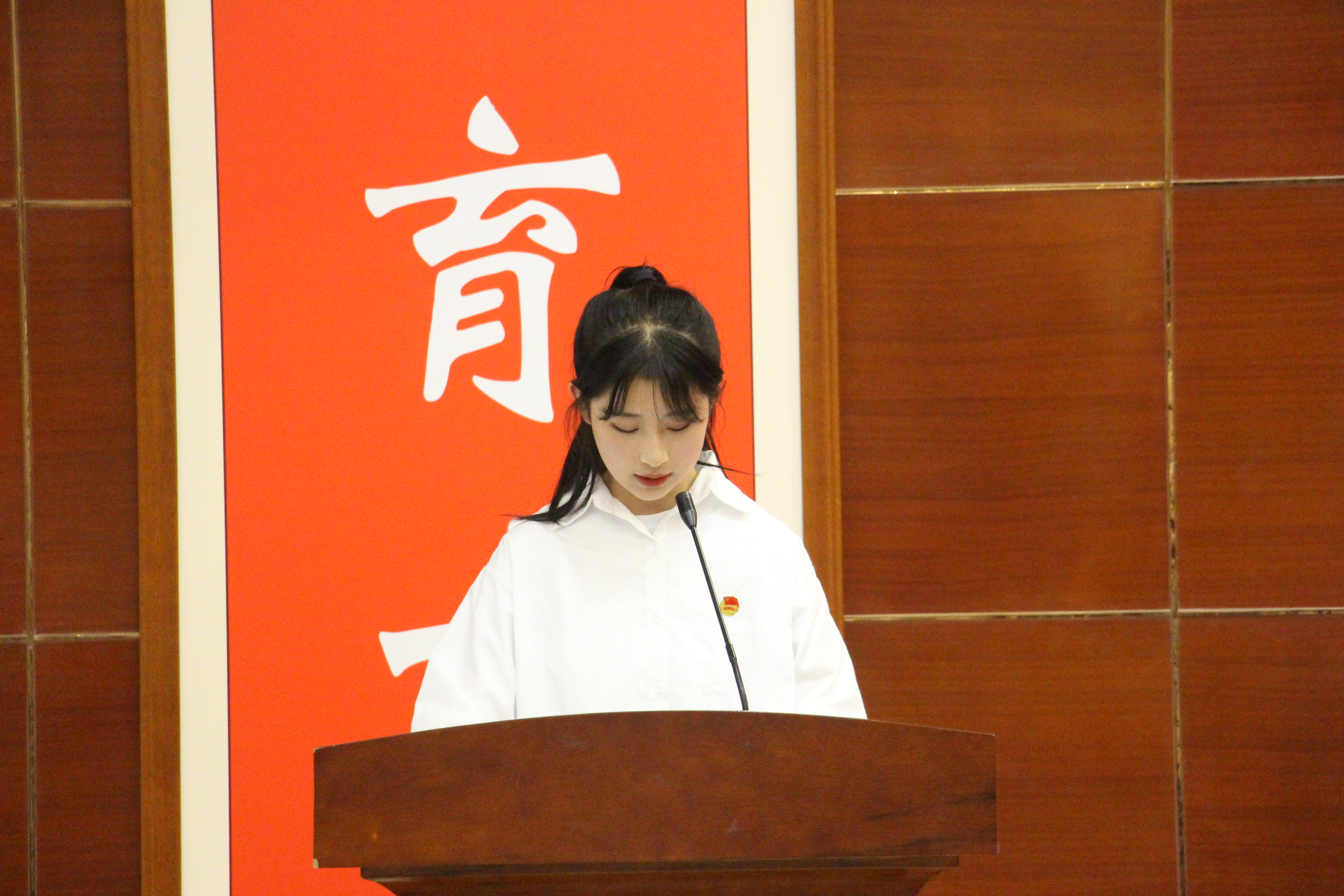 院團委老師劉吉仁宣讀了75名新團員名單,團員代表馬婧向新團員闡釋了團徽的組成及象征的意義,老團員代表為新團員代表佩戴團徽。隨后,全體新老團員面對著鮮艷的團旗,緊握右拳莊嚴宣誓。
