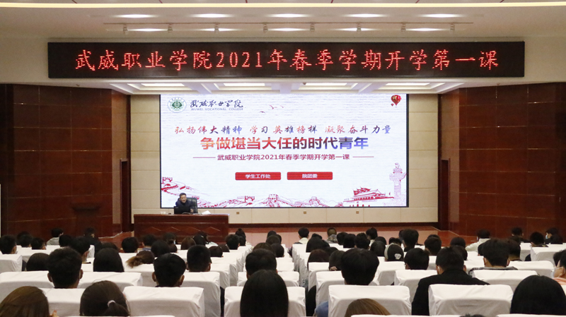 3月8日,是武威職業(yè)學(xué)院2021年春季學(xué)期開學(xué)第一天,為進(jìn)一步加強(qiáng)大學(xué)生思想政治教育,培育和踐行社會(huì)主義核心價(jià)值觀,培養(yǎng)學(xué)生的愛國情強(qiáng)國志報(bào)國行,增強(qiáng)學(xué)生安全意識(shí)和防護(hù)能力,保障教育教學(xué)工作平穩(wěn)有序進(jìn)行。學(xué)院利用晚自習(xí)時(shí)間為8100余名學(xué)生共同進(jìn)行了“弘揚(yáng)偉大精神,學(xué)習(xí)英雄榜樣,凝聚奮斗力量,爭做堪當(dāng)大任的時(shí)代青年”為主題的“開學(xué)第一課”。