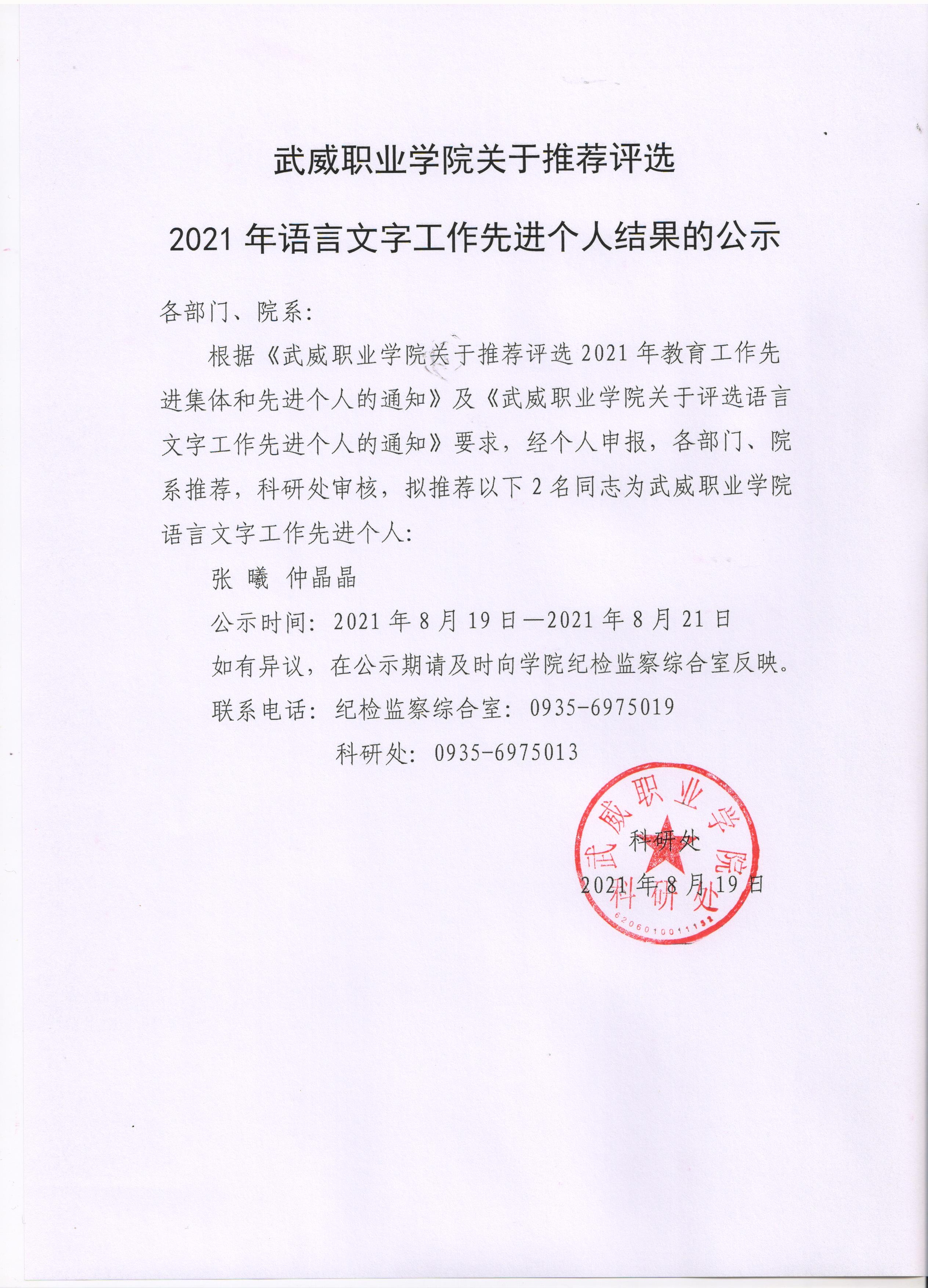 武威職業(yè)學(xué)院關(guān)于推薦評(píng)選2021年語(yǔ)言文字工作先進(jìn)個(gè)人結(jié)果的公示