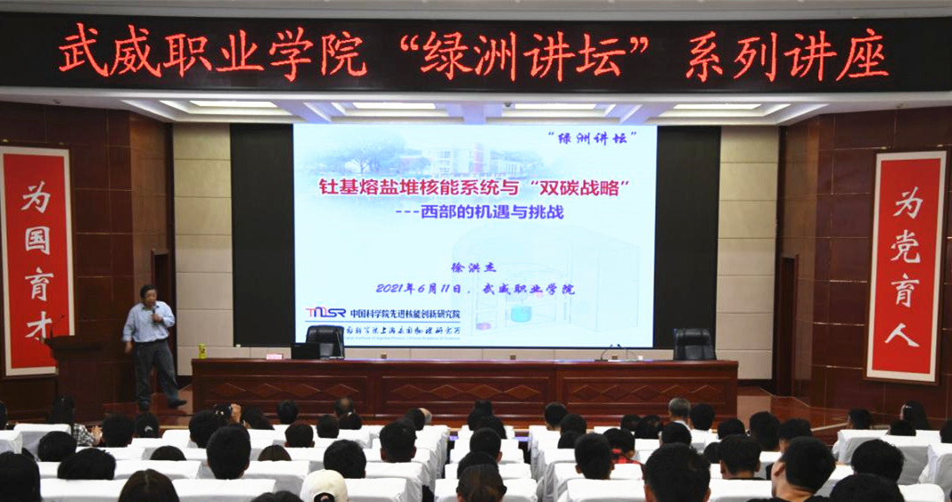 在全院上下深入開展黨史學(xué)習(xí)教育之際,為進一步推進省級“雙高計劃”建設(shè),促進中科低碳新能源技術(shù)學(xué)院創(chuàng)新發(fā)展,深化學(xué)院教育教學(xué)改革,6月11日,學(xué)院第45期“綠洲講壇”開講,本次論壇邀請中國科學(xué)院上海應(yīng)用物理研究所研究員、博士生導(dǎo)師兼中國科學(xué)院先進核能創(chuàng)新研究院院長徐洪杰為全院師生作題為《基于釷基熔鹽堆的風(fēng)光核儲多能融合系統(tǒng)——西部“雙碳戰(zhàn)略”之路的機遇和挑戰(zhàn)》的主旨報告。中國科學(xué)院上海應(yīng)用物理研究所黨委書記、副所長趙明華研究員,武威園區(qū)園區(qū)辦主任趙先堂,聯(lián)合辦學(xué)主管兼中科低碳新能源技術(shù)學(xué)院院長助理米麗娟博士出席,學(xué)院領(lǐng)導(dǎo)班子成員、中層干部、各院系師生代表共220余人參加報告會。報告會由學(xué)院黨委書記、院長趙明主持。