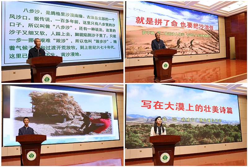 報(bào)告會(huì)上,二代治沙人代表、八步沙林場場長郭萬剛,二代治沙人代表、八步沙林場職工賀中強(qiáng),三代治沙人、八步沙林場管護(hù)員郭璽、武威市廣播電視臺(tái)記者袁潔,分別從綠色承諾、使命責(zé)任、接續(xù)奮斗、記者見證等不同角度、不同側(cè)面,生動(dòng)再現(xiàn)了“六老漢”三代人治沙造林持續(xù)改善生態(tài)環(huán)境、讓沙漠披綠生金的感人事跡。在場師生無不為“六老漢”三代人的感人事跡深深震撼,紛紛表示要學(xué)習(xí)和繼承“六老漢”三代人困難面前不低頭、敢把沙漠變綠洲的奮斗精神,為建設(shè)美麗中國、實(shí)現(xiàn)中華民族永續(xù)發(fā)展貢獻(xiàn)自己的青春力量。