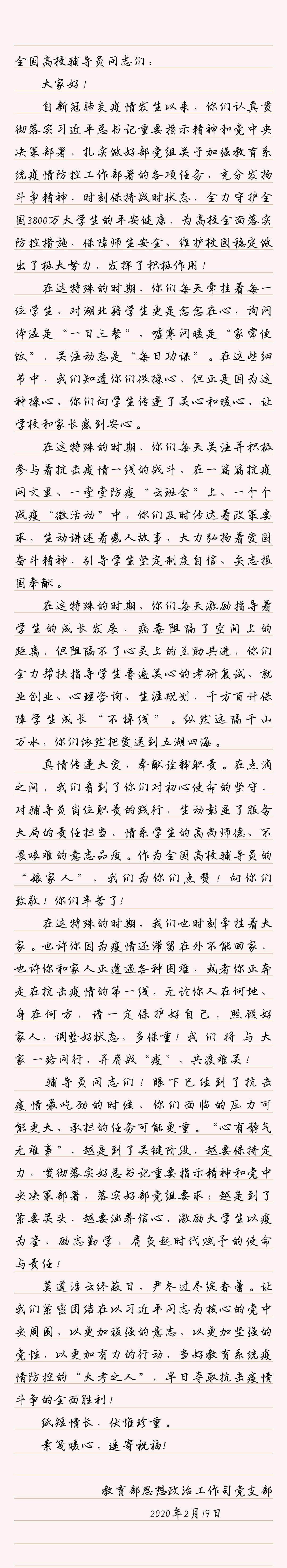 共克時(shí)艱 勠力同行 | 教育部思政司黨支部致全國高校輔導(dǎo)員的一封信