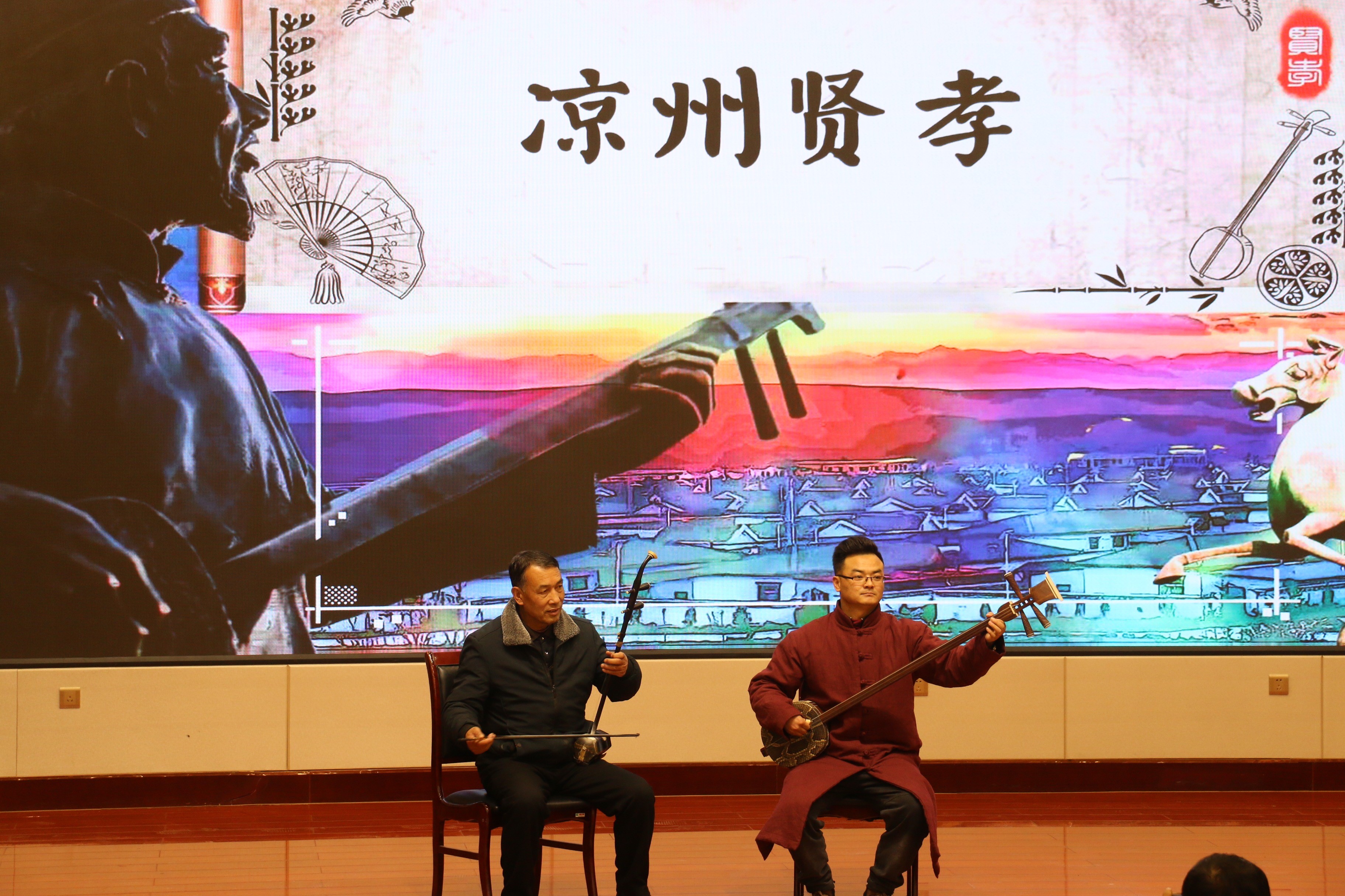 隨后,賈旭峰圍繞涼州賢孝的起源、分類、使用的樂器、唱法、創(chuàng)新傳承與現(xiàn)代價(jià)值等做了專題報(bào)告。涼州賢孝又稱“涼州勸善書”或“瞎賢”,內(nèi)容以說唱英雄賢士、忠臣良將、孝子賢女等故事,教化人們“處事為賢,居家盡孝”。涼州賢孝唱本分國(guó)書和家書,“家書”取材于家庭生活的方方面面,“國(guó)書”主要歌頌安邦定國(guó)的忠臣良將的高尚品德與智慧,勸導(dǎo)為人要賢,為子要孝,注重行為,貢獻(xiàn)社會(huì)。