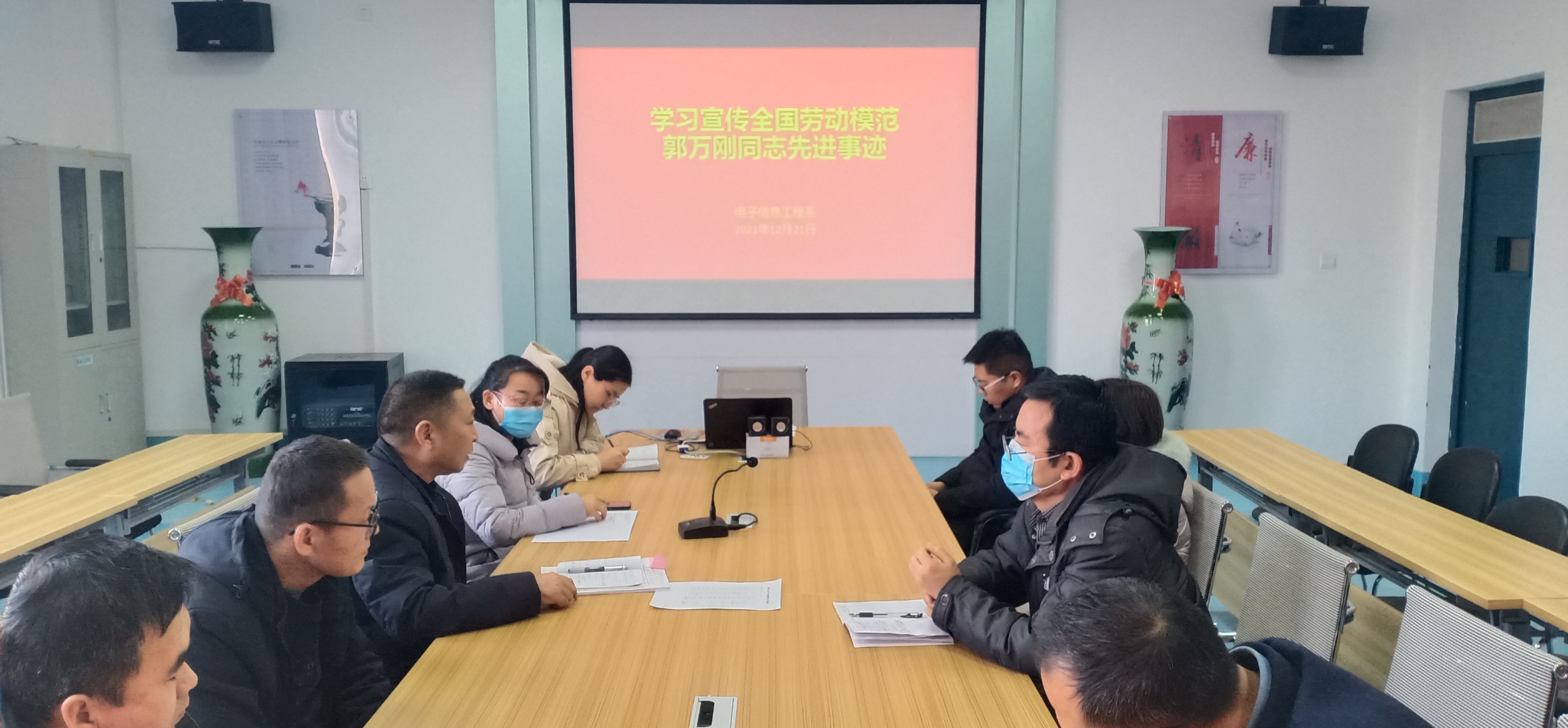 12月23日下午,電子信息工程系組織全體教師在明德樓409會議室學習全國勞動模范郭萬剛同志先進事跡。