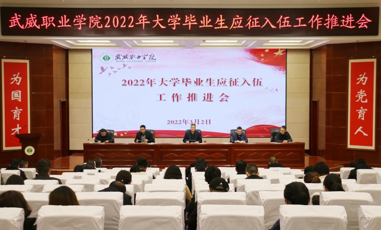 會議傳達(dá)了全國、全省征兵工作電視電話會議精神和省教育廳、武威軍分區(qū)有關(guān)大學(xué)畢業(yè)生應(yīng)征入伍工作的要求,通報了我校目前畢業(yè)生報名和體檢通過情況,向各教學(xué)院系分解下達(dá)了2022年大學(xué)畢業(yè)生應(yīng)征入伍任務(wù)。學(xué)校武裝部專職工作人員對畢業(yè)生參軍入伍國家的優(yōu)惠政策和學(xué)校的十項措施進(jìn)行了宣講。