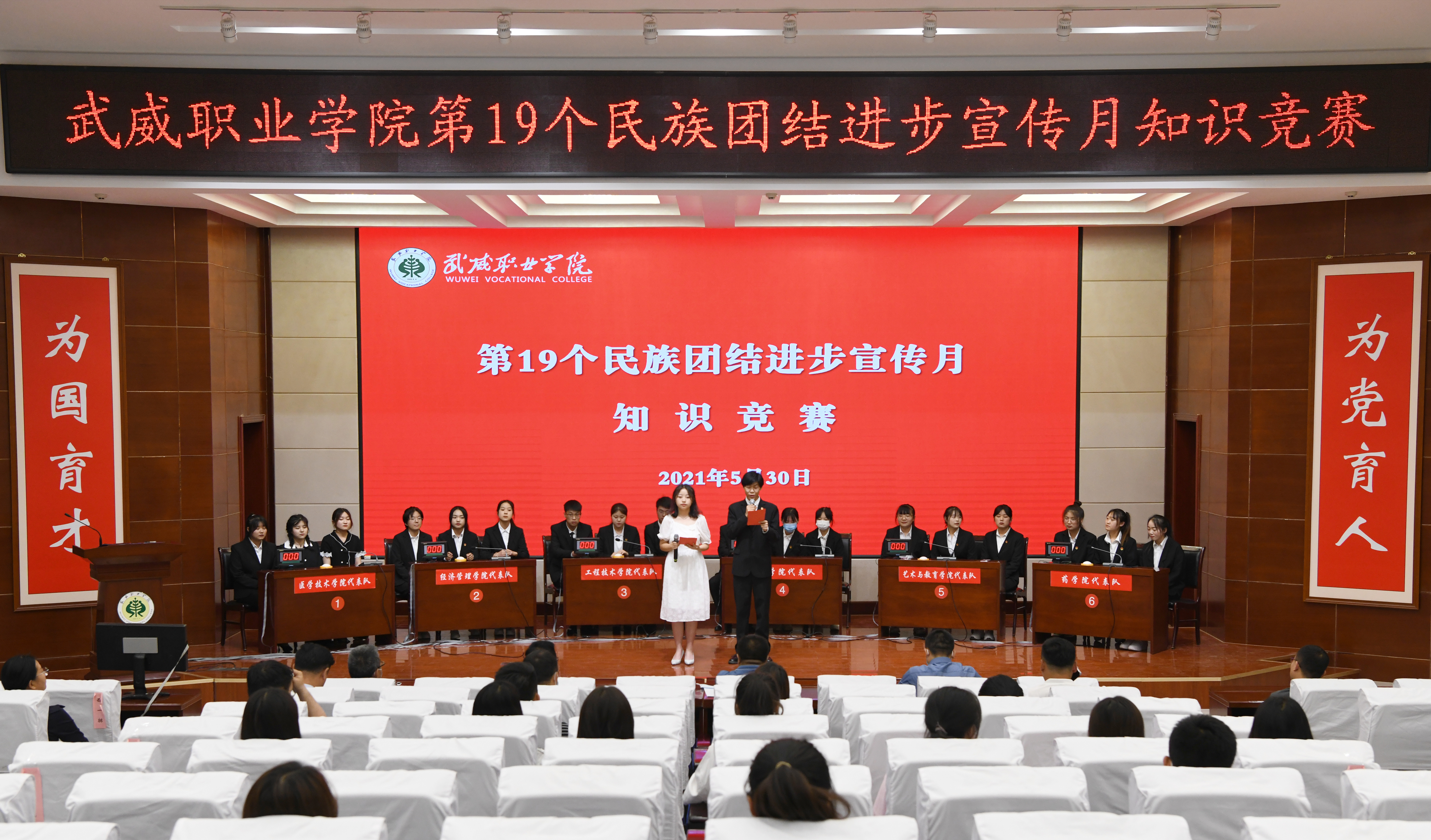 經(jīng)過(guò)前期的初賽、復(fù)賽,共有6支參賽隊(duì)進(jìn)入知識(shí)競(jìng)賽決賽,競(jìng)賽內(nèi)容涵蓋了習(xí)近平新時(shí)代中國(guó)特色社會(huì)主義思想、中央民族工作會(huì)議精神、中華民族歷史發(fā)展知識(shí)、各民族優(yōu)秀傳統(tǒng)文化、中國(guó)夢(mèng)等方面內(nèi)容,充分彰顯了中華民族一家親、同心共筑中夢(mèng)的精神。競(jìng)賽中,參賽選手以飽滿的精神,踴躍答題,你追我趕,氣氛十分熱烈。經(jīng)過(guò)激烈的角逐,藥學(xué)院獲得此次知識(shí)競(jìng)賽第一名。醫(yī)學(xué)技術(shù)學(xué)院獲得學(xué)校第19個(gè)民族團(tuán)結(jié)進(jìn)步宣傳月系列活動(dòng)優(yōu)秀組織獎(jiǎng)。