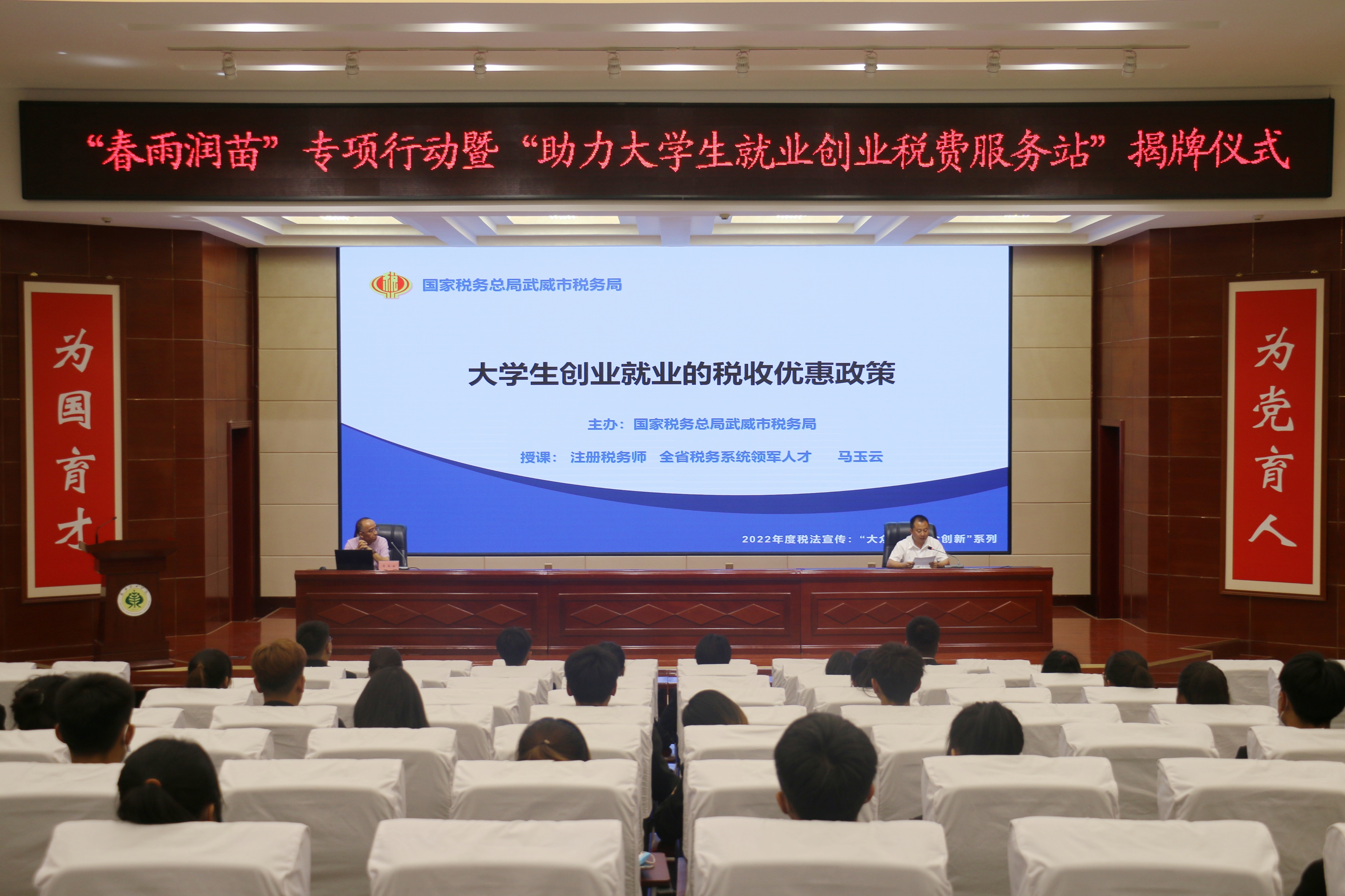 揭牌儀式結(jié)束后,武威市稅費專家顧問團隊代表馬玉云為學(xué)校師生帶來“就業(yè)創(chuàng)業(yè)稅費第一課”的報告,向大學(xué)生們普及稅法知識,特別針對高校畢業(yè)生就業(yè)創(chuàng)業(yè)稅費優(yōu)惠政策、組合式稅費支持政策、個人所得稅政策以及社保繳納等內(nèi)容進行了詳細解讀,為大學(xué)生創(chuàng)業(yè)就業(yè)新苗送上一場“及時雨”。